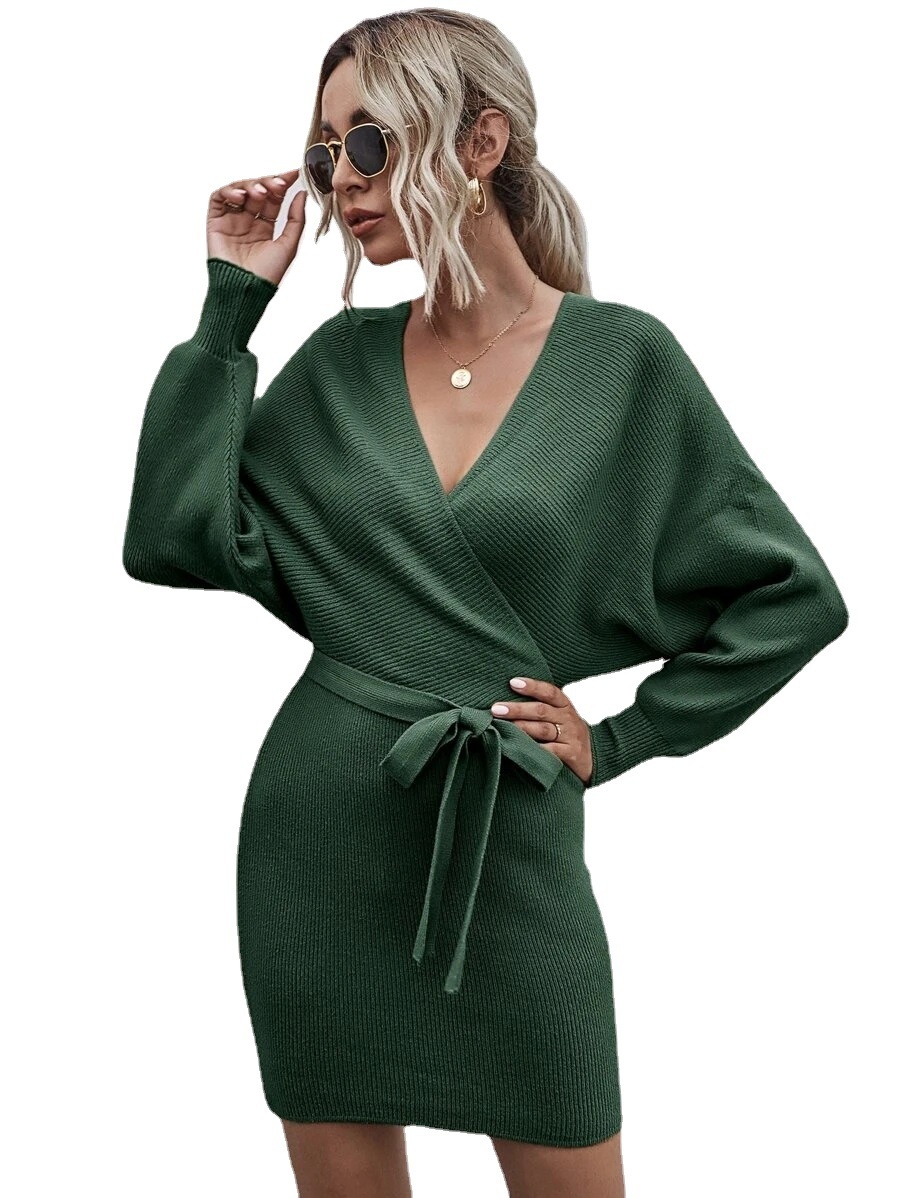 Autumn And Winter European And American Foreign Trade Women's Sweater V-neck Bat Sleeve Knitted Dress