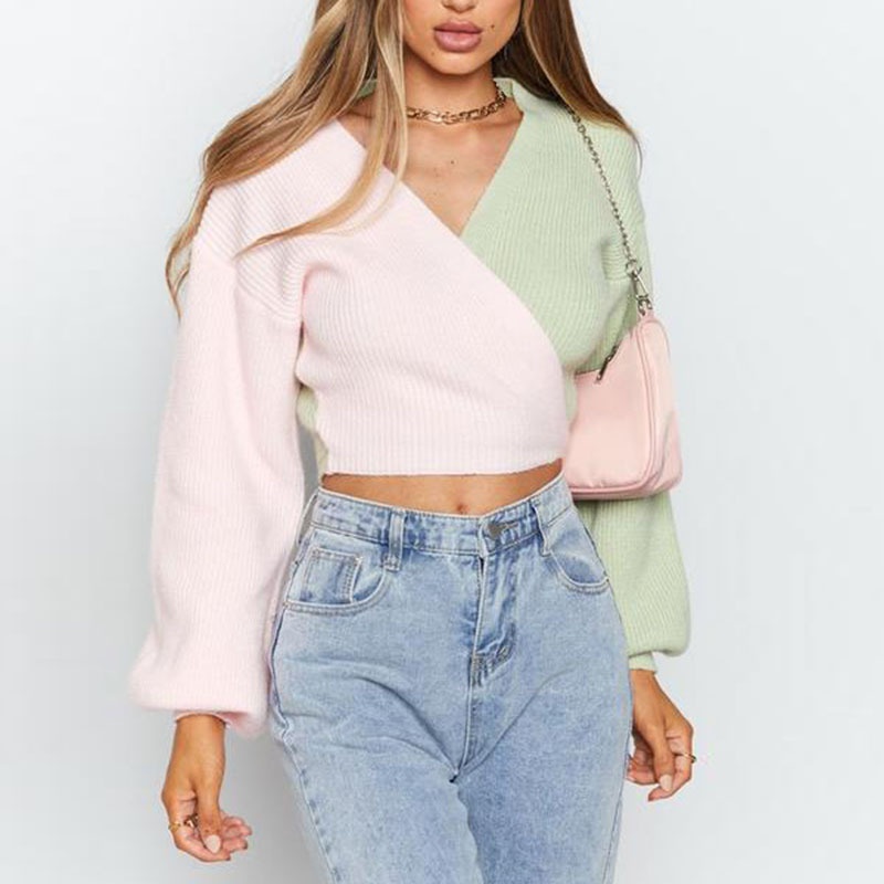 Autumn And Winter Contrast Color Stitching Cross- Strap Long Sleeve Loose Knitted Sweater Pullover