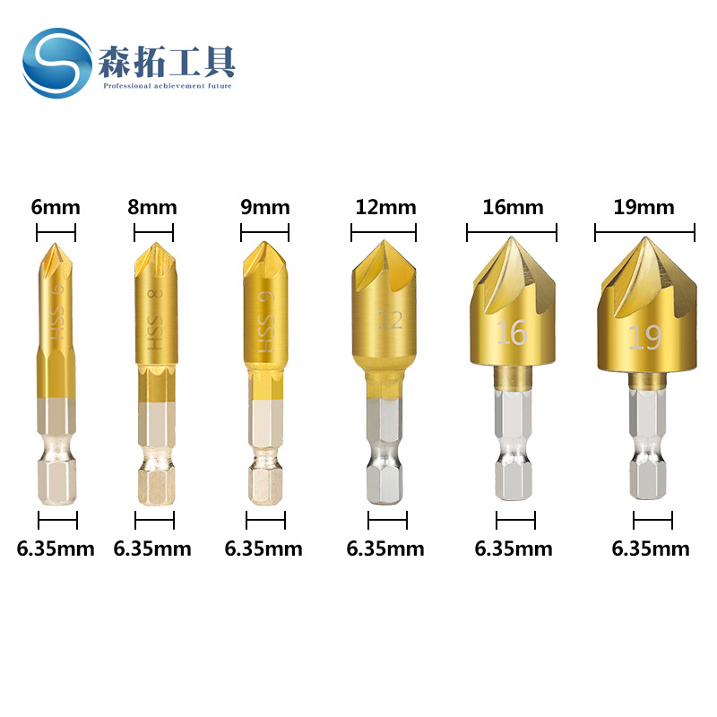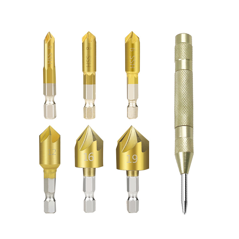 Hexagonal Handle Titanium-plated Five-edged Chamfer Woodworking Deburring Tool Automatic Center Punching Combination Set