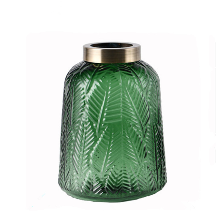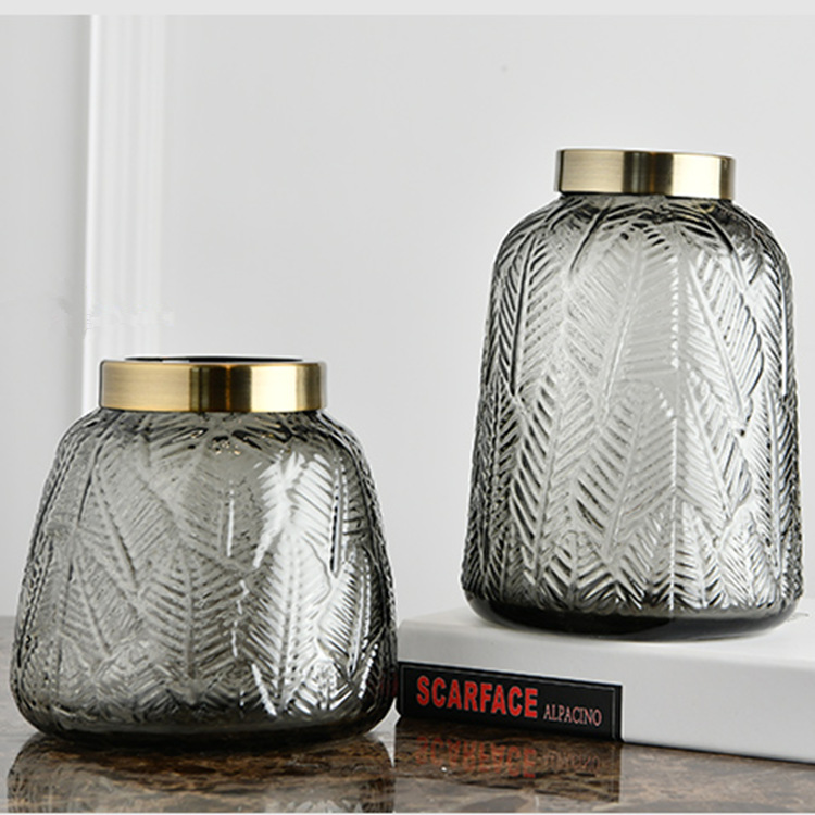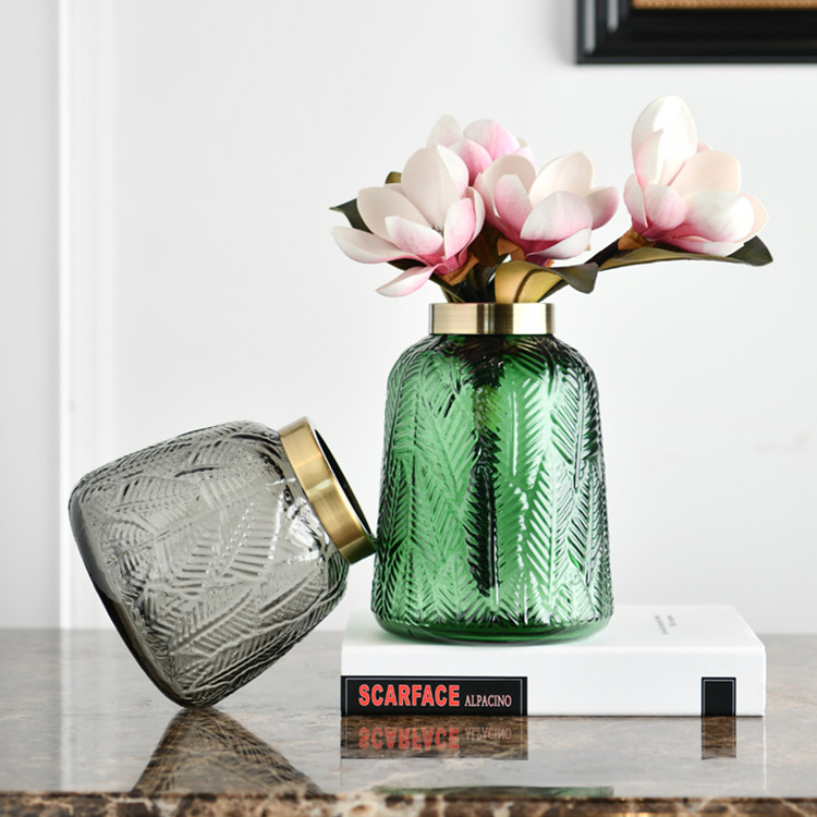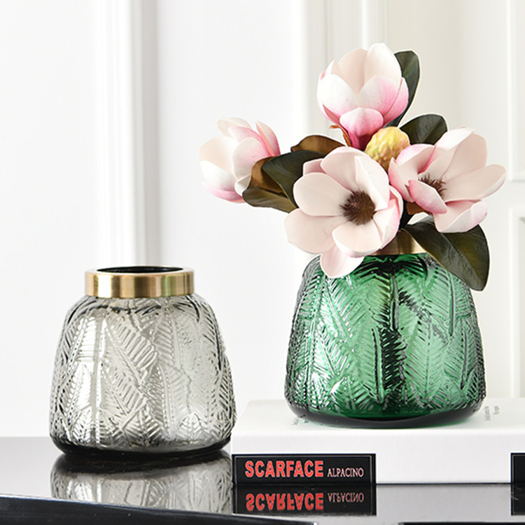 Clearance!Copper Ring Leaf Pattern Glass Vase,High-end Handmade Small Mouth Flower Ware,Home Decoration,Light Luxury