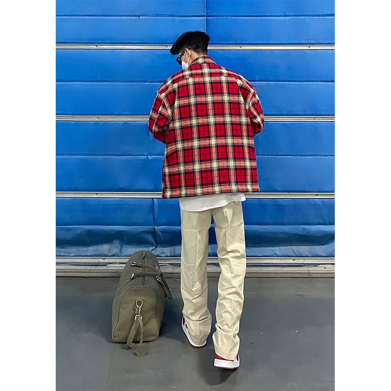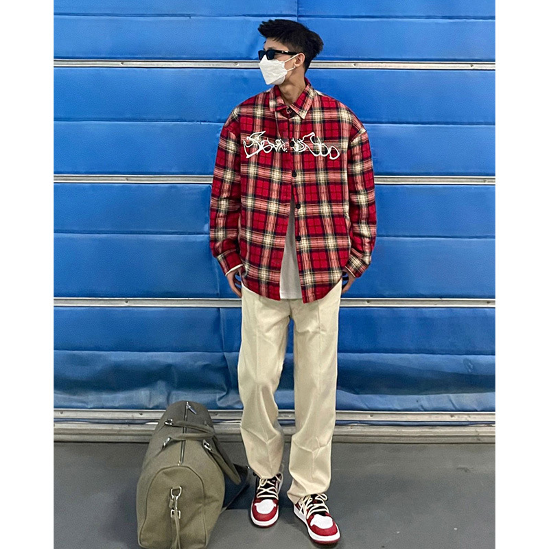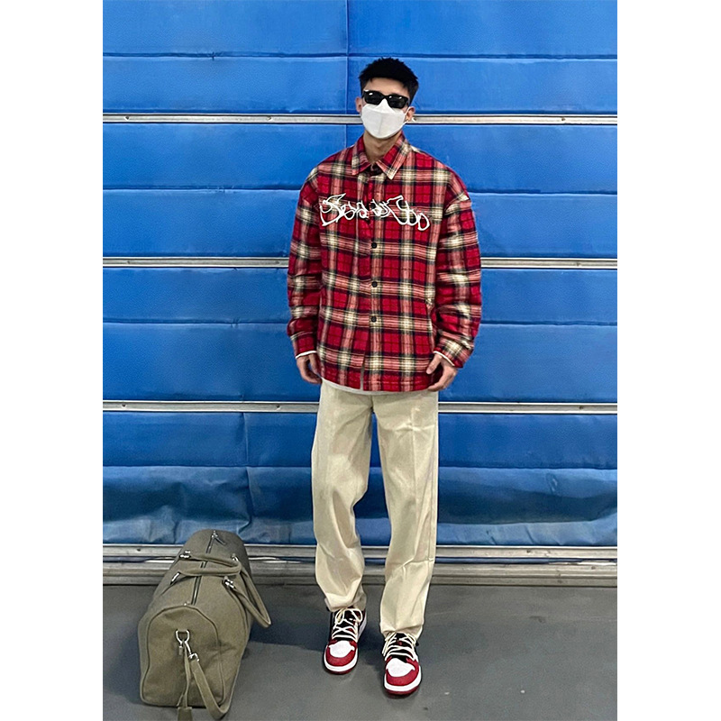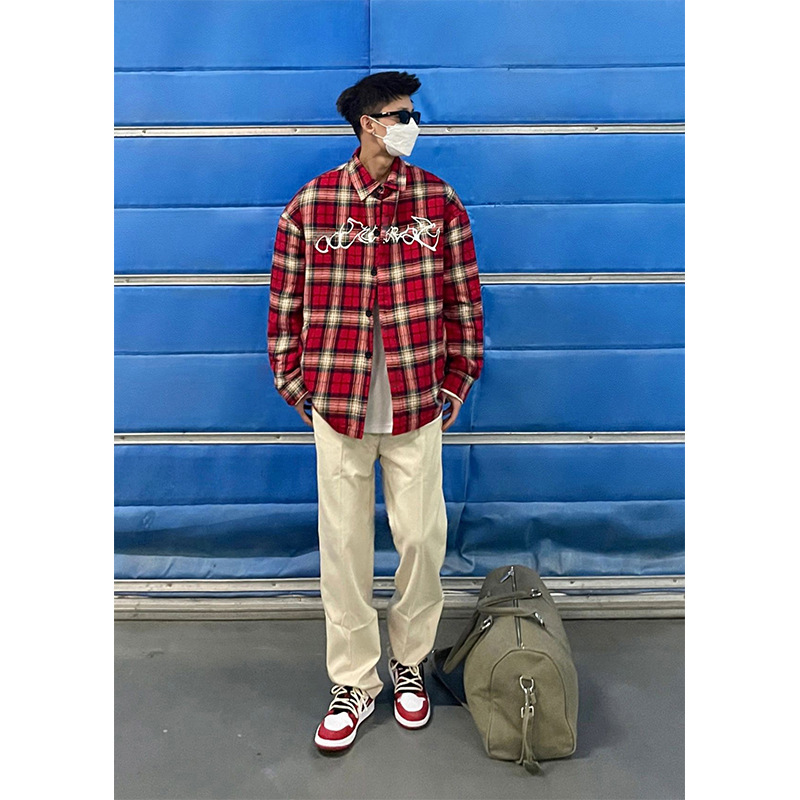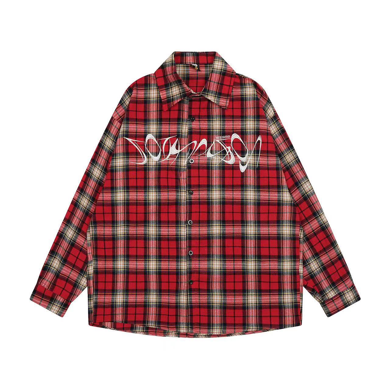 American Embroidery Red Plaid Casual Shirt Men's Long-sleeved Loose Spring And Autumn Shirty High Street Couple Jacket
