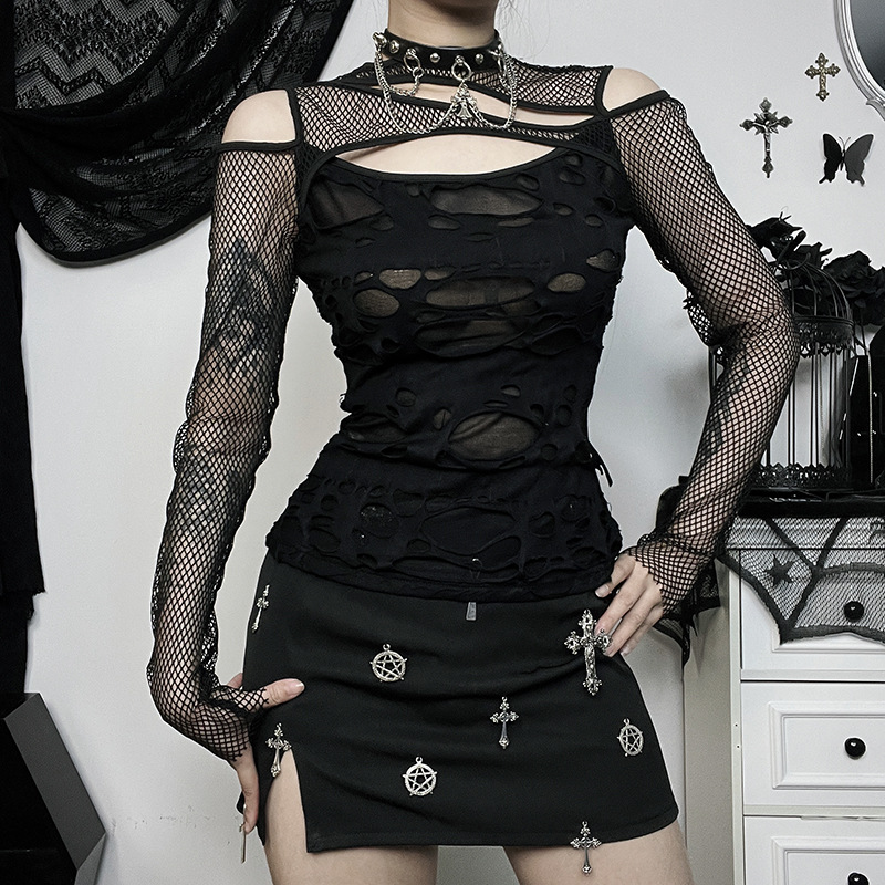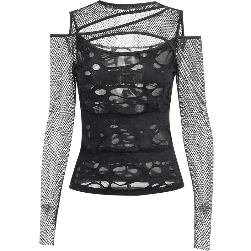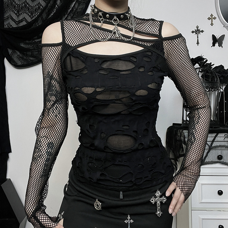 CF23498 Autumn Personalized Women's Clothing Dark Style Hottie Sexy Slim Mesh Ripped Long-sleeved Top For Women