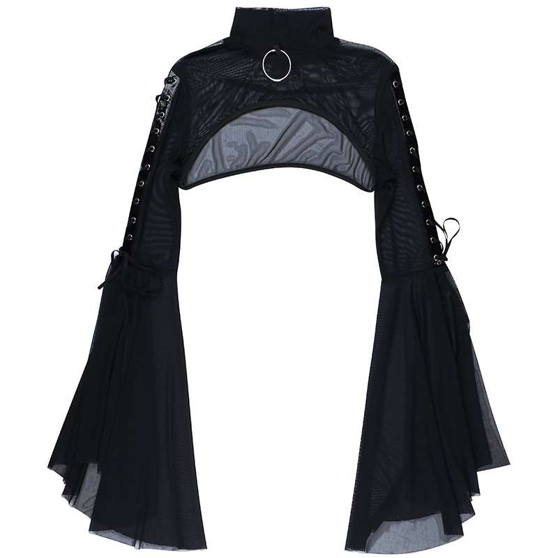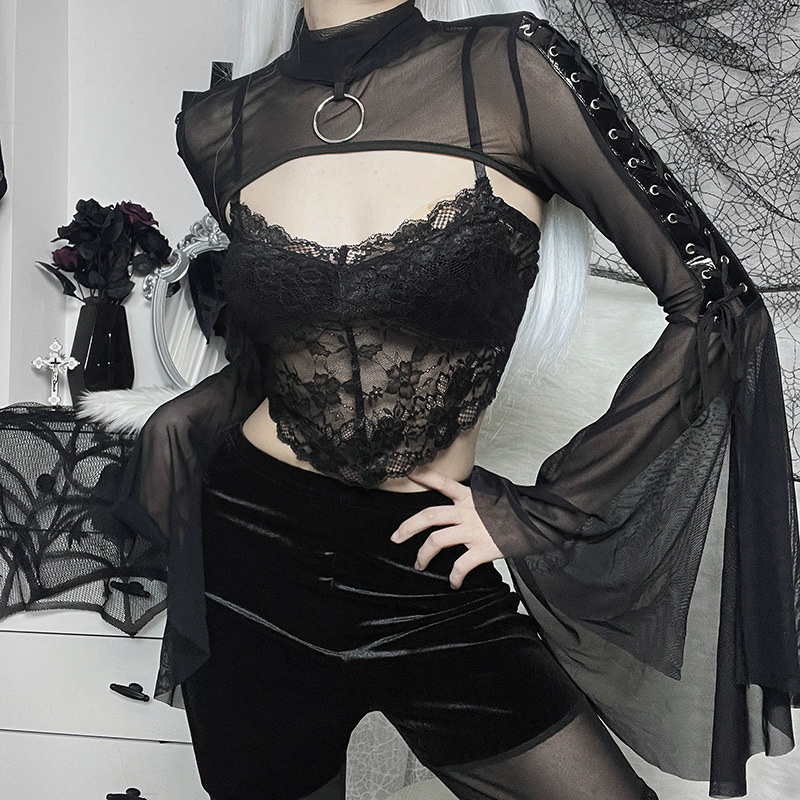 WY2 Temperament See-through Mesh Top For Women With Dark Style Half High Collar Bell Sleeves Double-sided Webbing Slim Waistcoat
