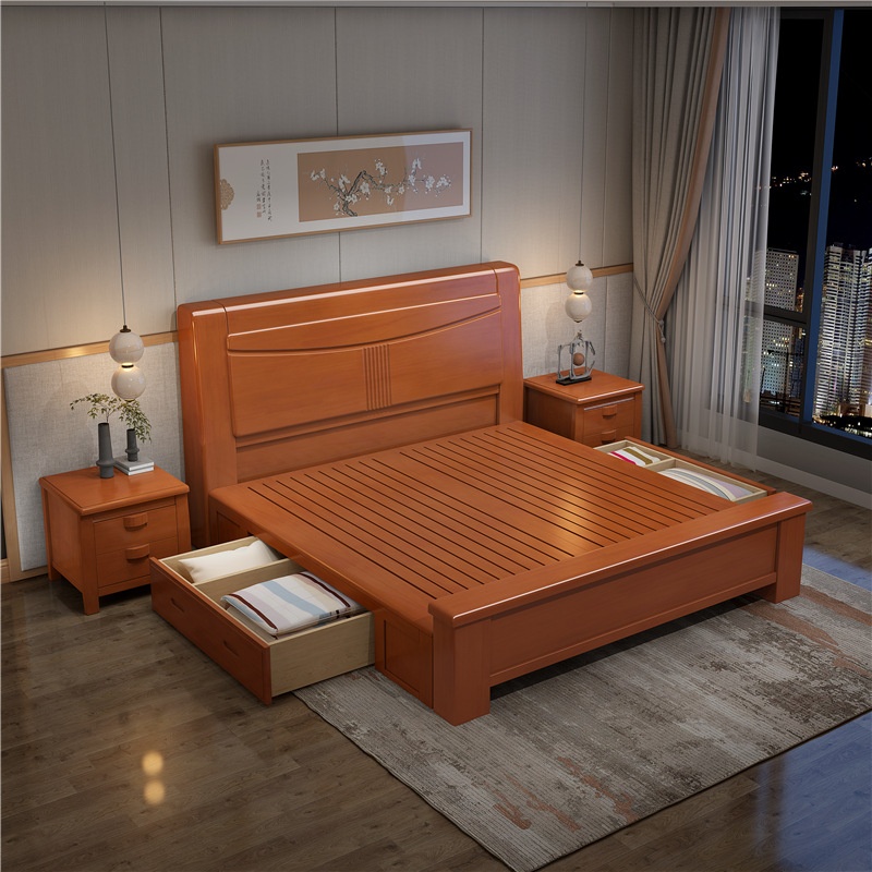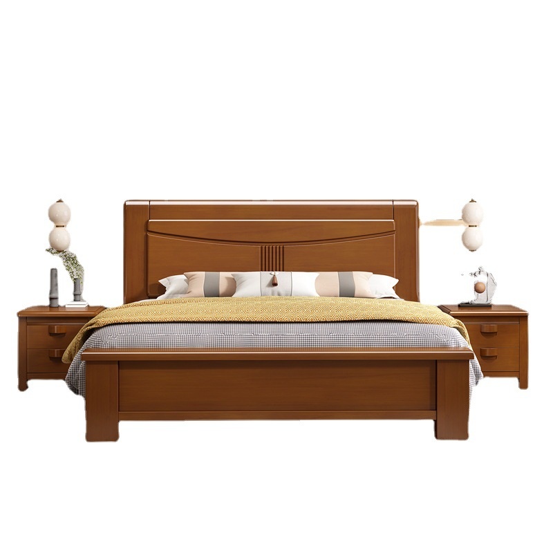 Chinese Solid Wood Bed1.8m Master Bedroom Double Bed Modern Simple1.5m Rubber Wood High Box Storage Bed Direct Sale