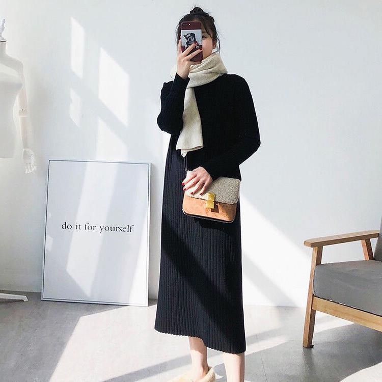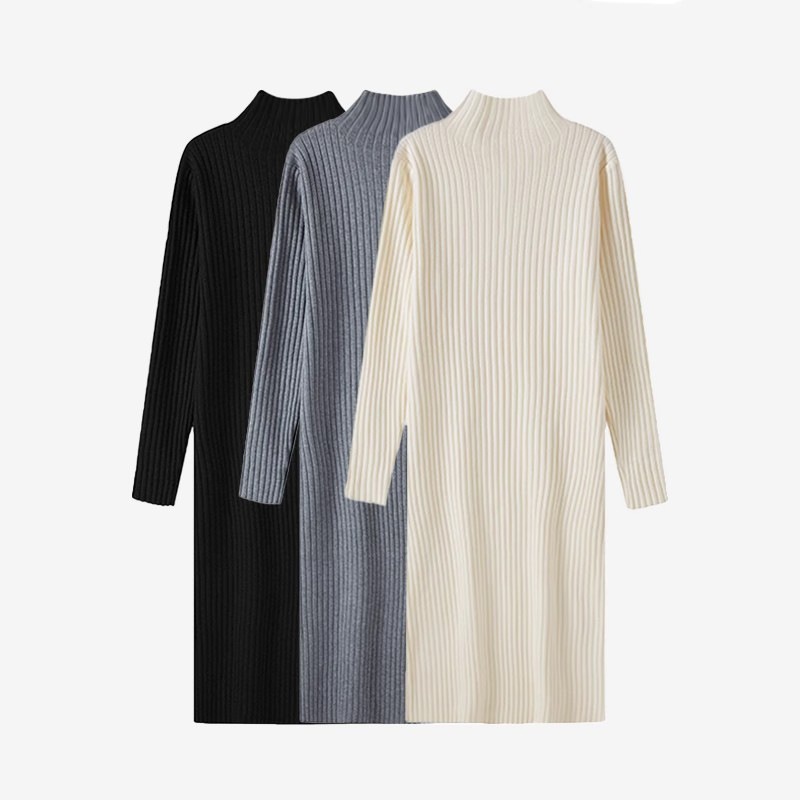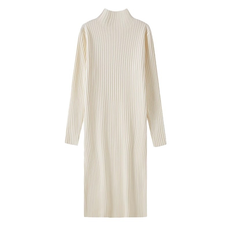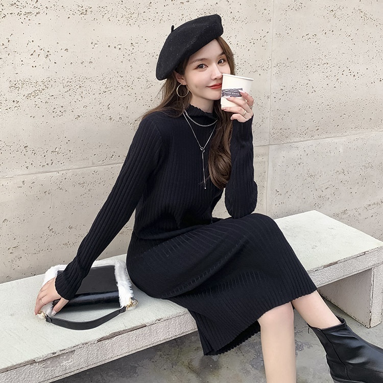 Knitted Dress For Women In Autumn And Winter With Coat, Half Turtleneck, Loose Long Sleeves, Black Bottoming Mid-length Sweater Skirt