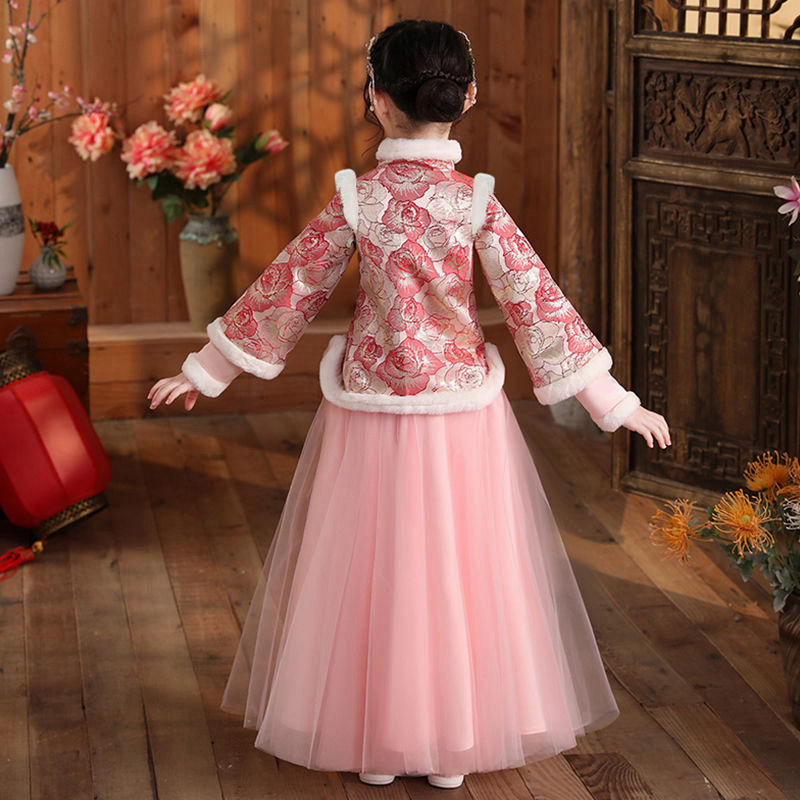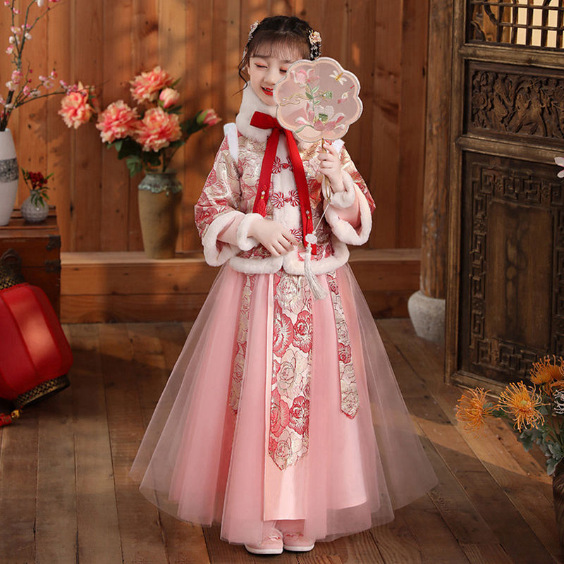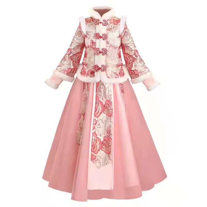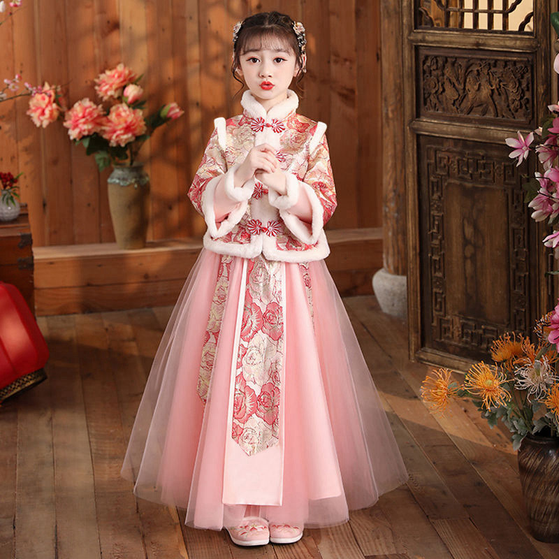 Girls Hanfu Dress Winter Chinese Style Children's Tang Suit Little Girl Plus Velvet Thickened Year's Celebration Dress
