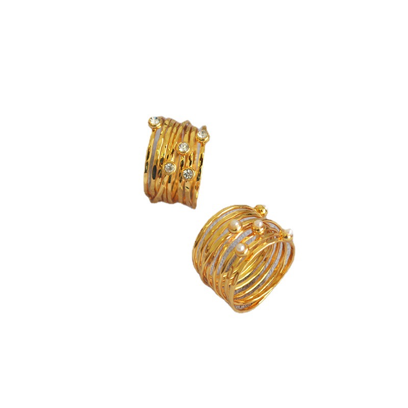 Super Beautiful Hand-wound French Retro Hammered Texture Multi-layer Winding Diamond-set Pearl Bird's Nest Ring Index Finger Ring For Women