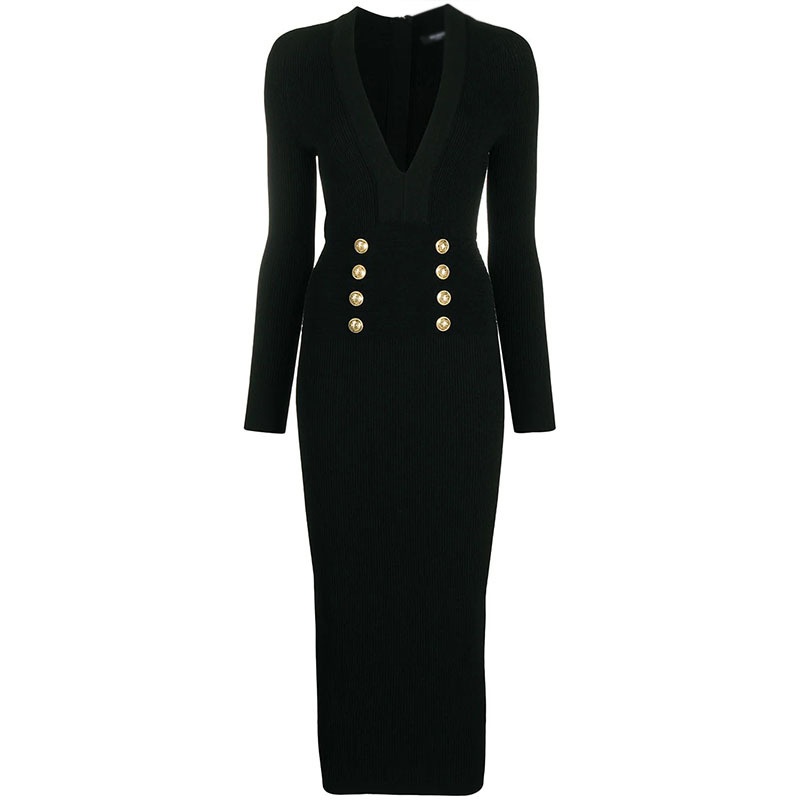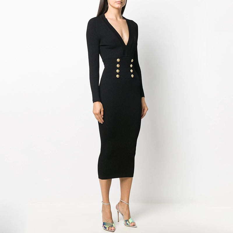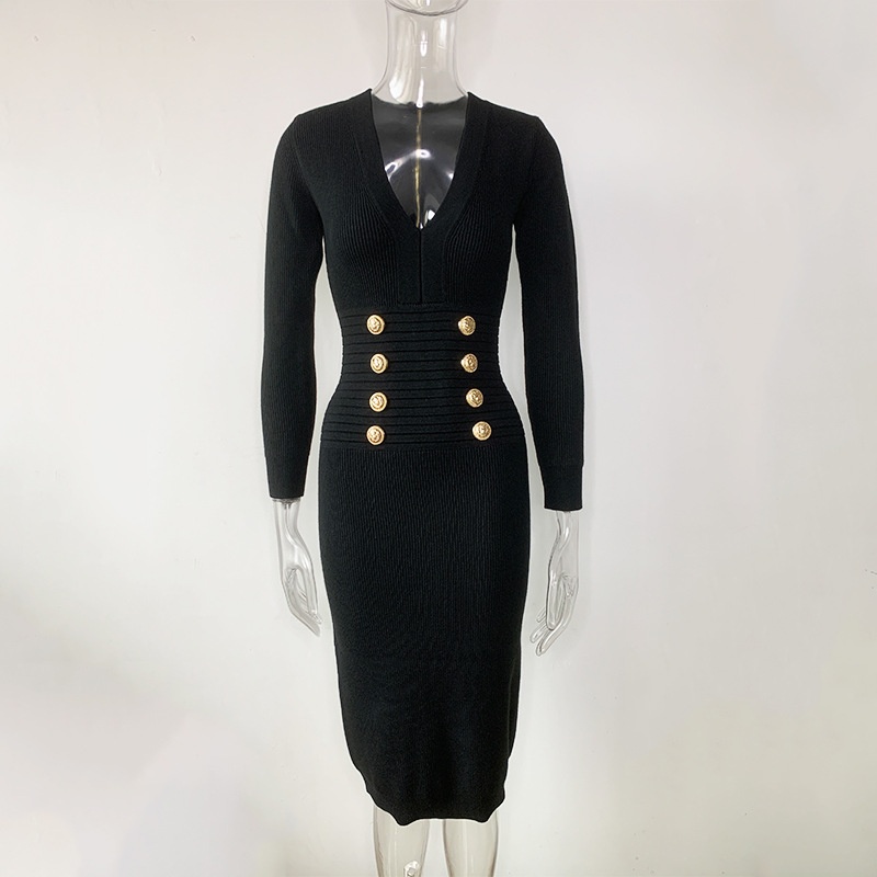 Foreign Trade Style Temperament V-neck Knitted Long Skirt Commuter Black High-waisted Autumn And Winter Wool Slim-fitting Bottoming Dress