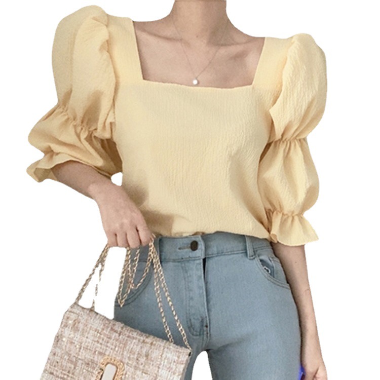 Korean Chic French Style Gentle Slim Square Collar Exposed Clavicle Top Design Pleated Puff Sleeve Chiffon Shirt Female