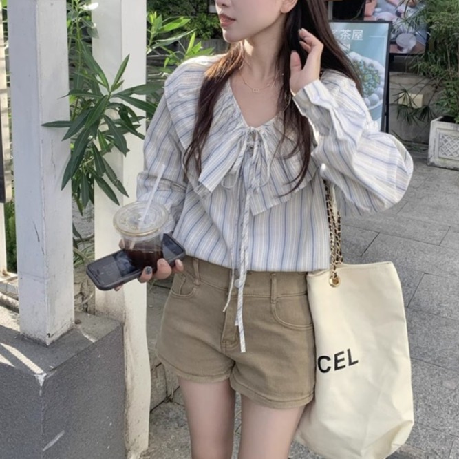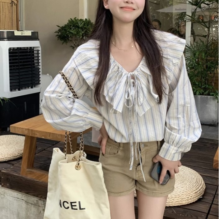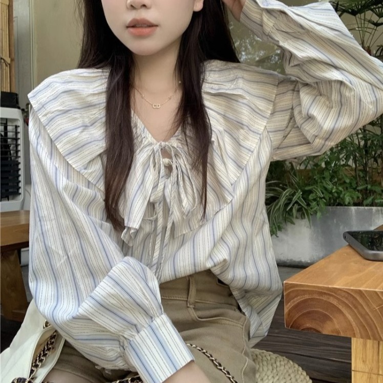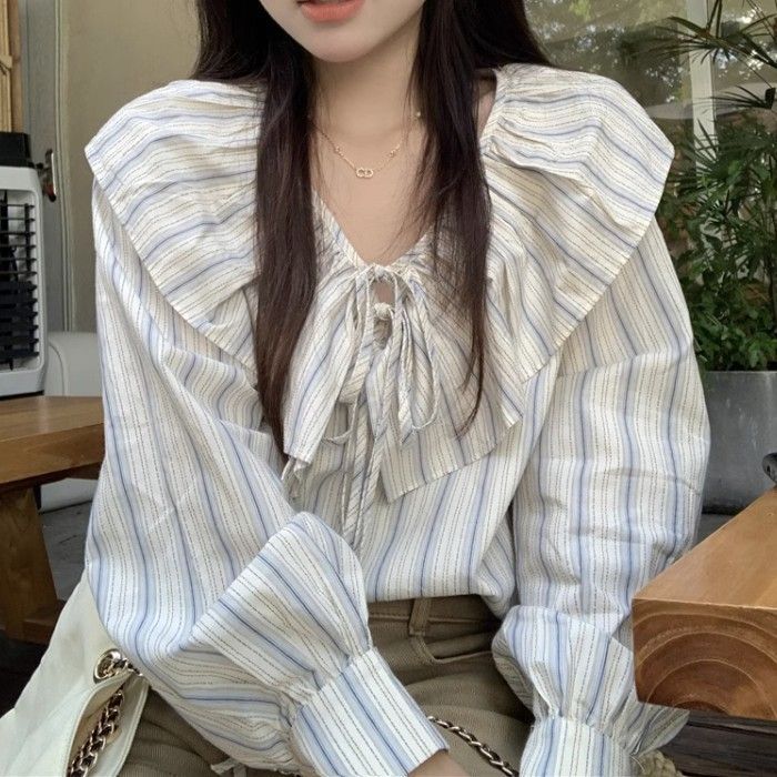 Gentle Style Temperament Beautiful Loose Shirt Female Spring Design Striped Doll Collar Long-sleeved Shirt