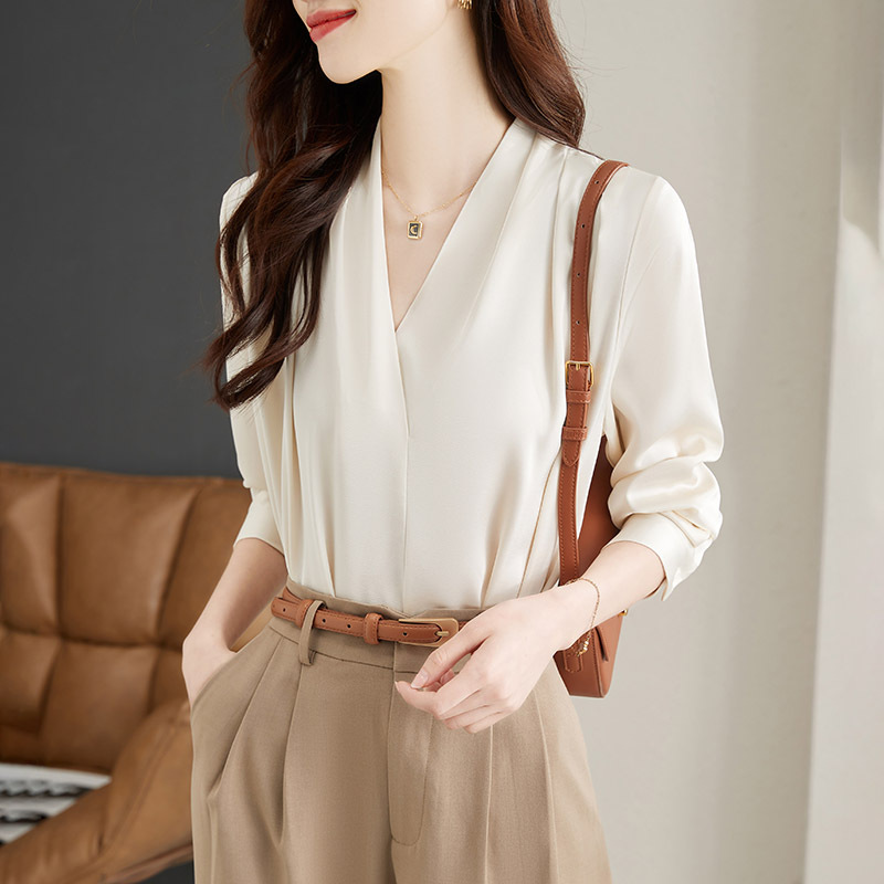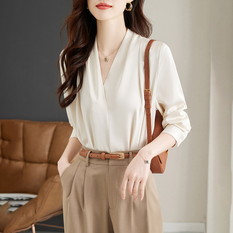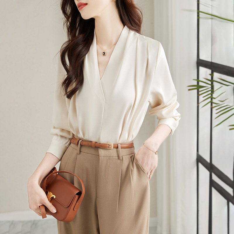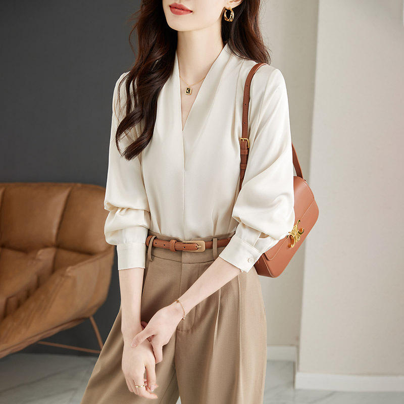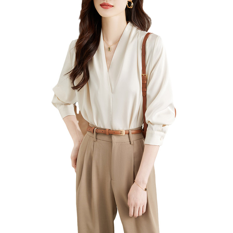 Spring And Autumn Design Korean Style V-neck Long-sleeved Temperament Shirt Chiffon Lazy Style Salt-line Shirt Women