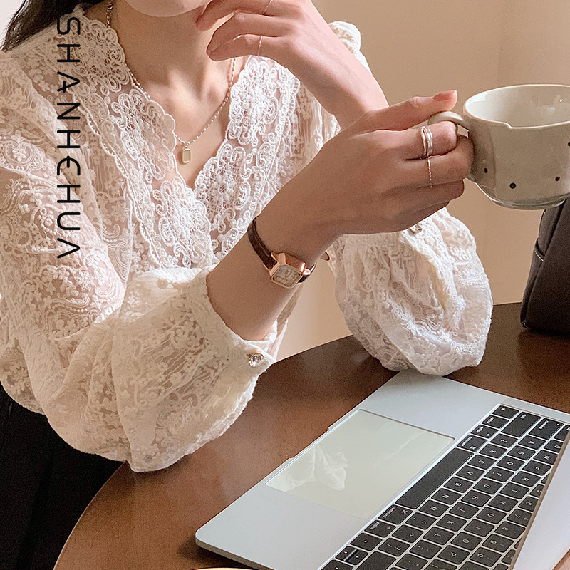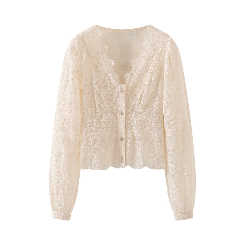 [Original]French Lace Cardigan For Women Spring V-neck Temperament Slimming Inner Bottoming Shirt Top