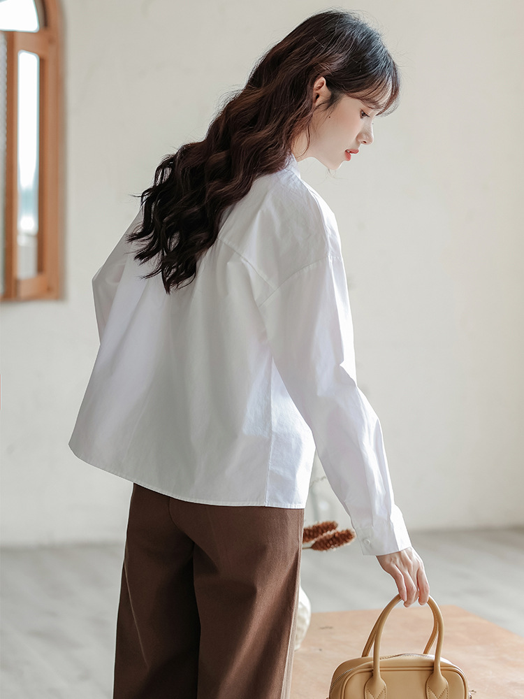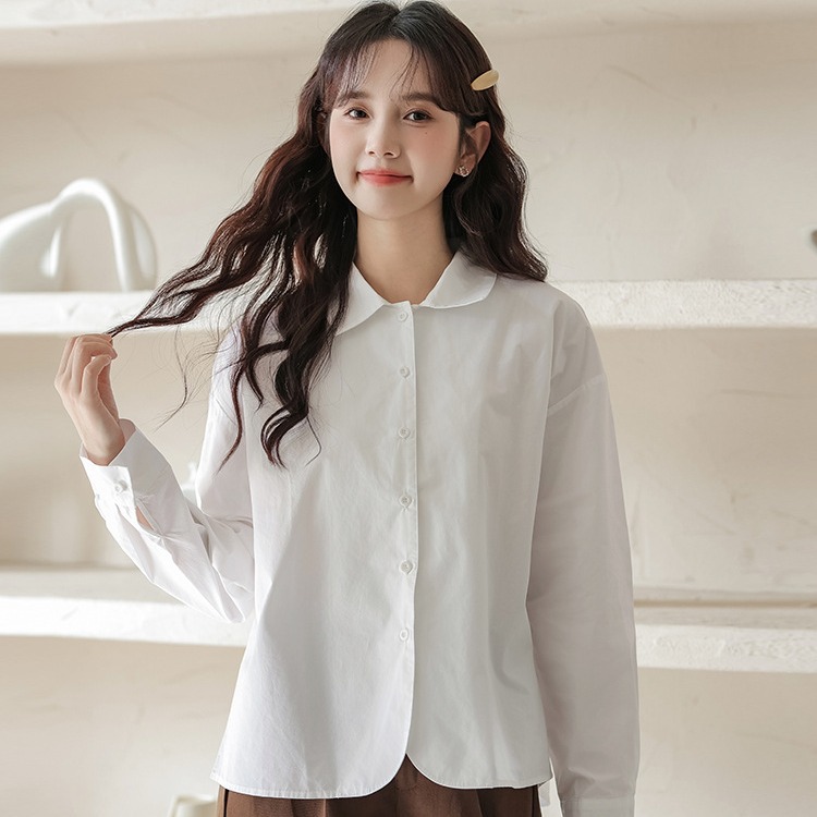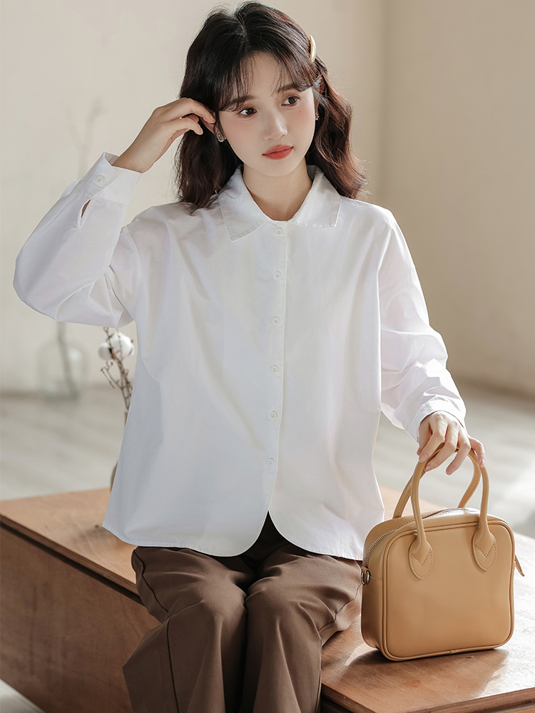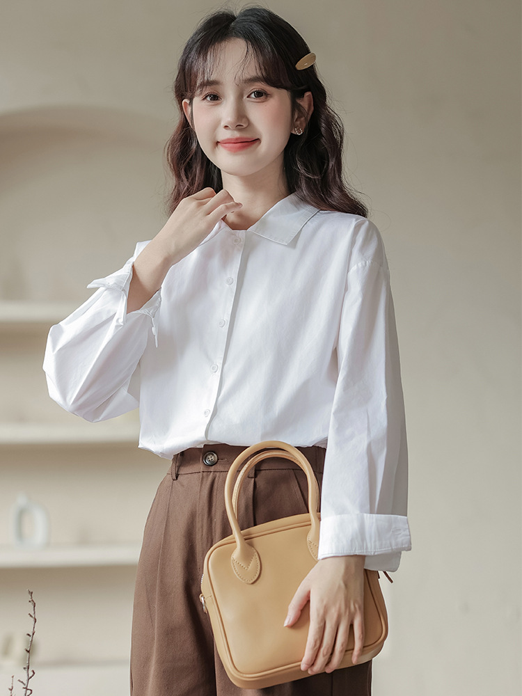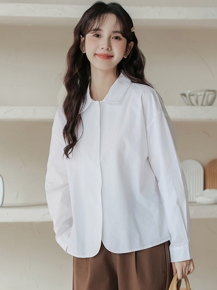 Women's White Shirt Spring Style Simple Versatile Lapel Design Irregular Hem Long-sleeved Shirt
