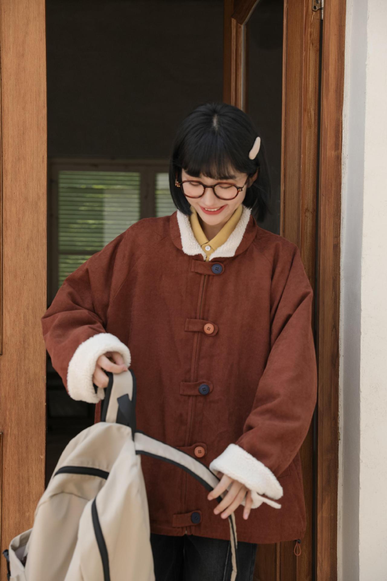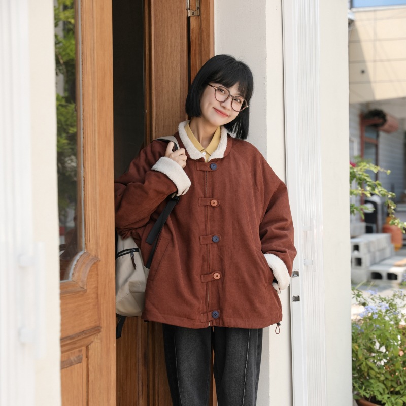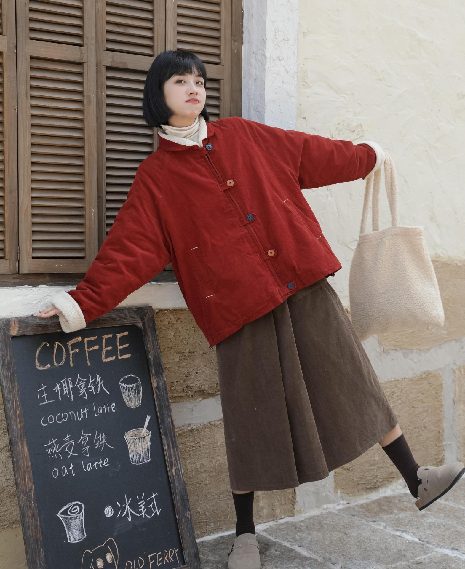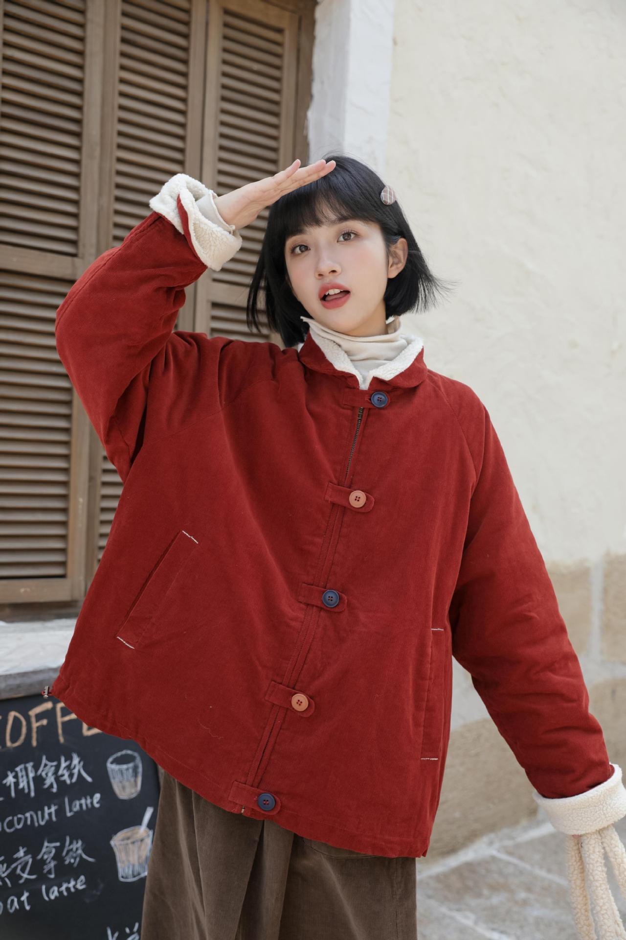 Actual Shot Of Winter Corduroy Japanese Retro Plush Lapel Thickened Design Cotton Coat For Women