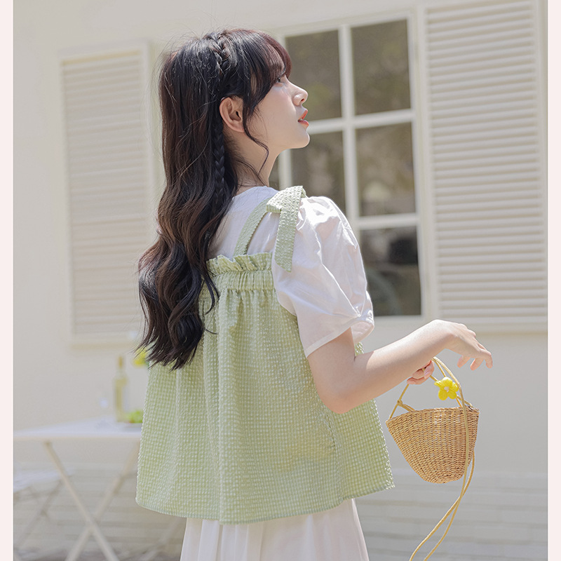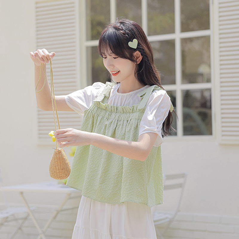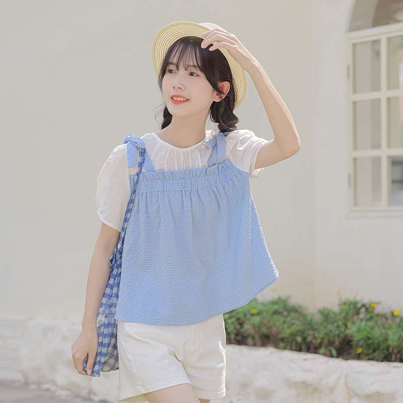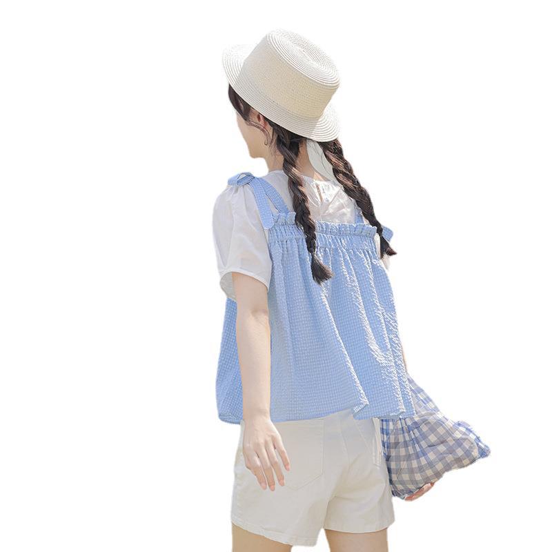 Summer Style Loose Fake Two-piece Spliced Plaid Short-sleeved Sweet Girly Style Round Neck Pullover Doll Shirt