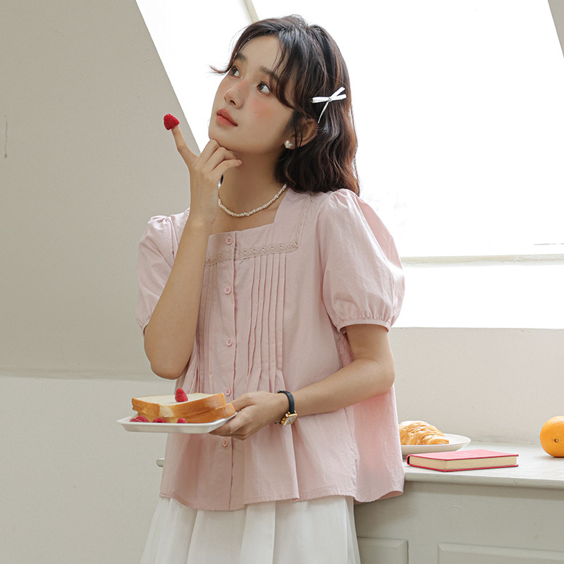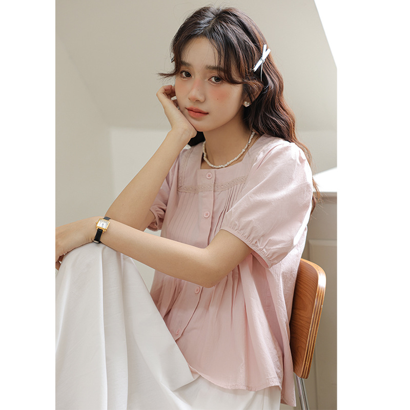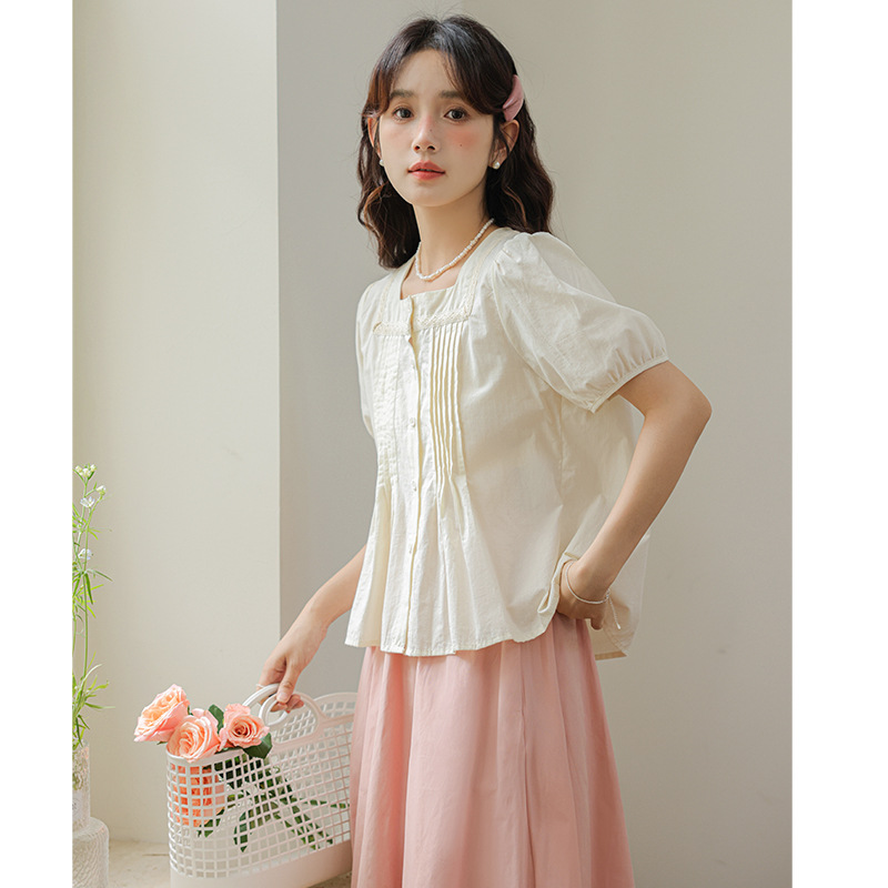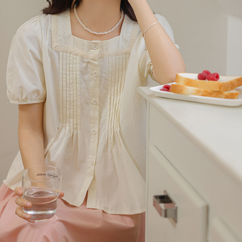 Summer Style Gentle Square Collar Lace Splicing Shirt Loose Solid Color Pleated Puff Short-sleeved Shirt For Women