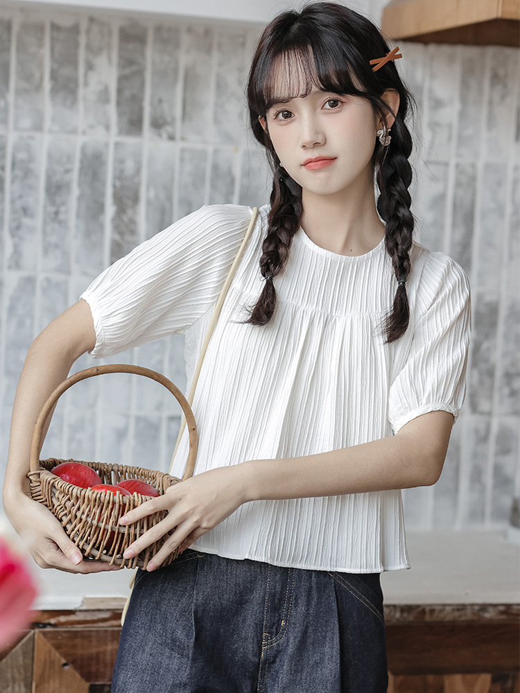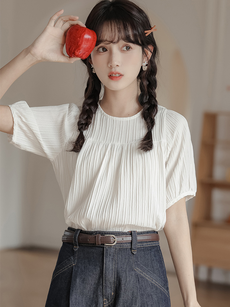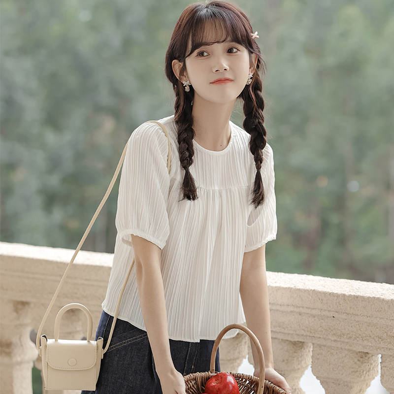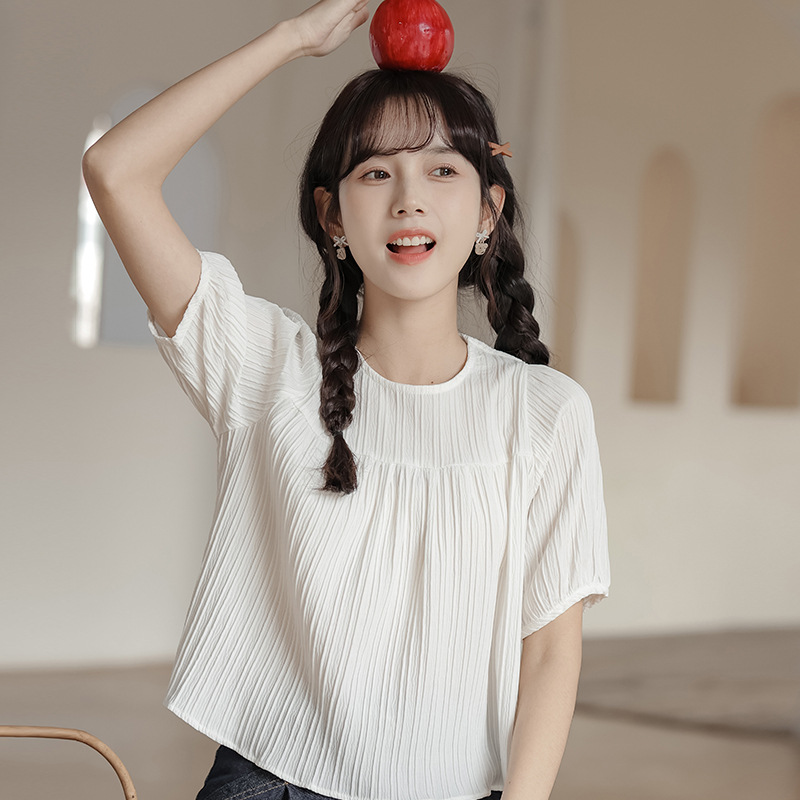 Actual Shot Of Summer Style Simple Pullover Small Fresh Round Neck Pleated Design Short-sleeved Chiffon Shirt Top For Women