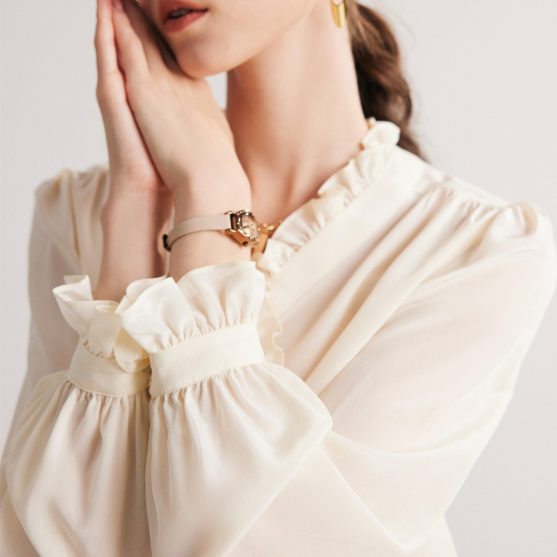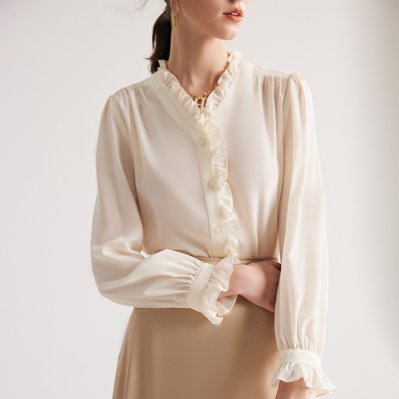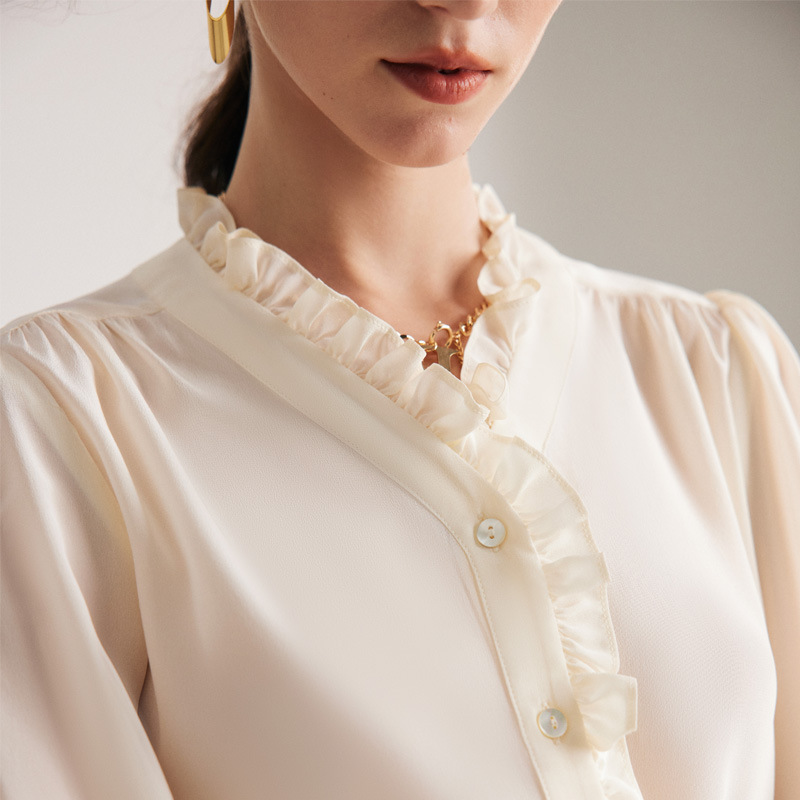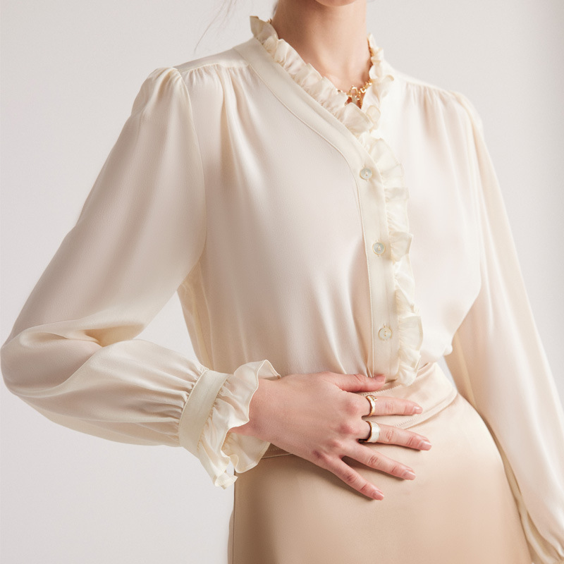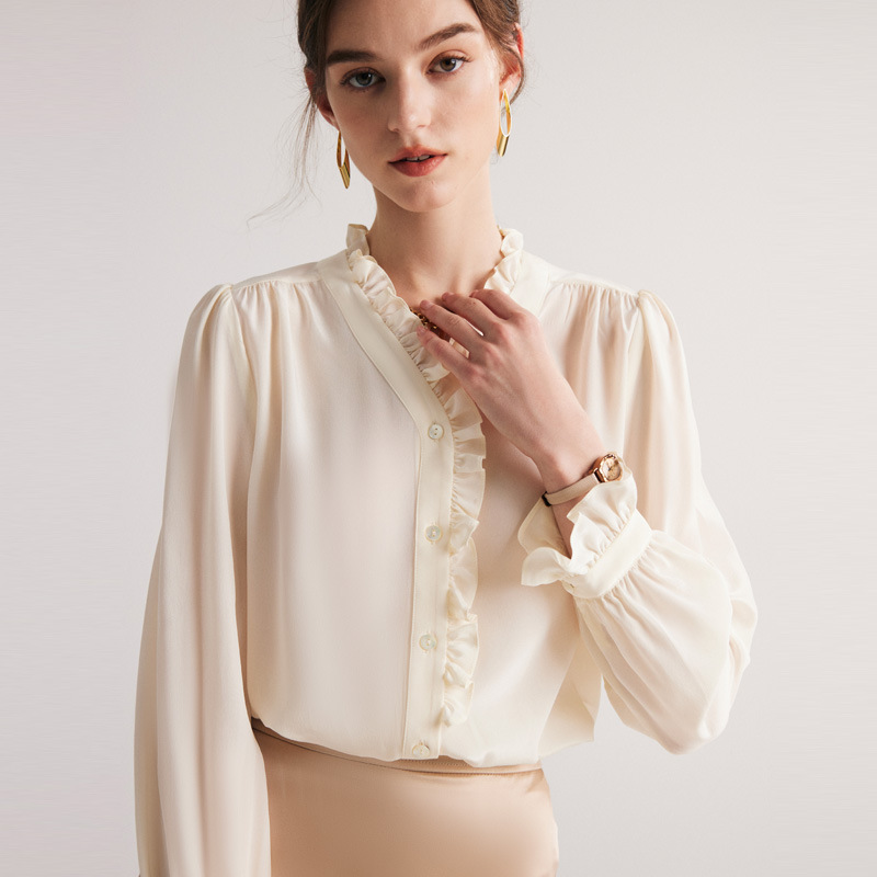 Silk Shirt Women Spring And Summer French Double Crepe Shirt White Commuter Lace100%Mulberry Silk Top