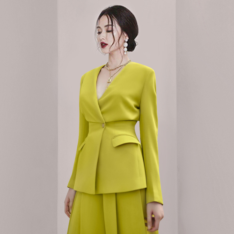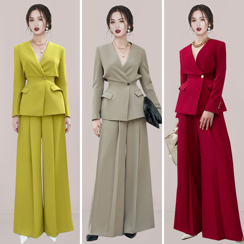Autumn And Winter Bright Color V-neck Waist Suit Top High Waist Pleated Wide Leg Pants Temperament Two-piece Suit