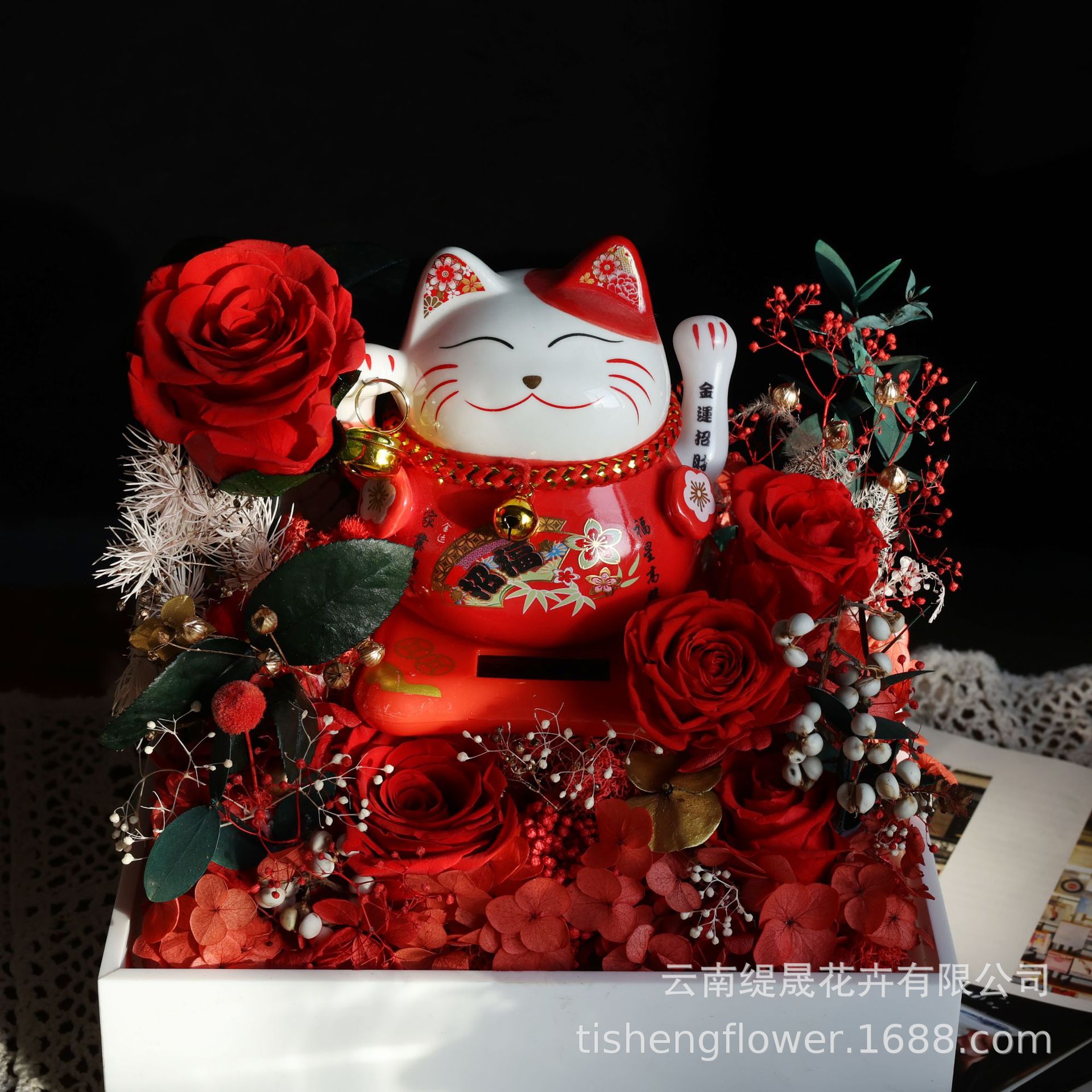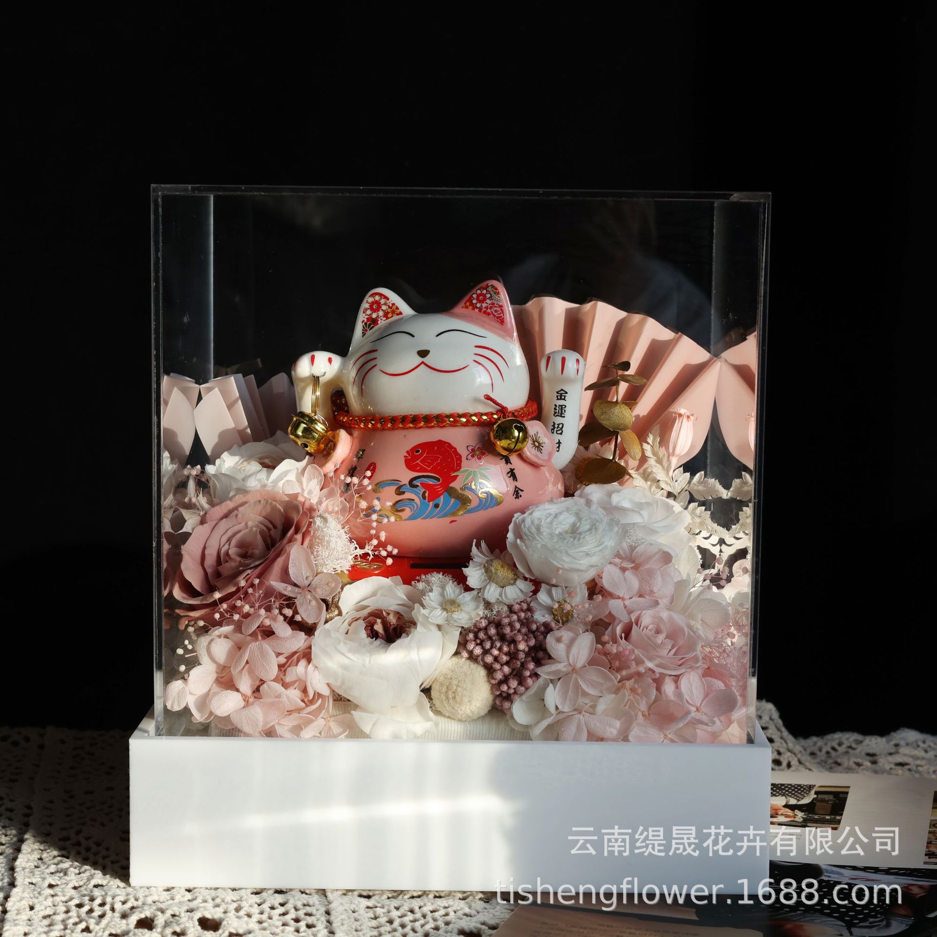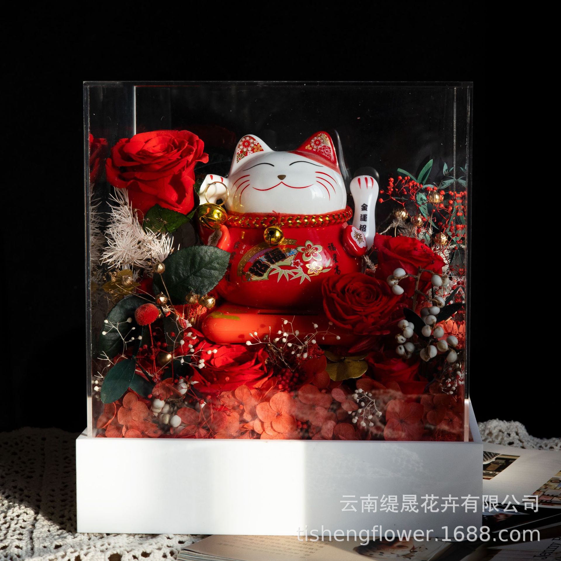 Lucky Cat Eternal Flower Finished Product Solar Automatic Waving Acrylic Cover Ornament Opening Housewarming Gift For Friends