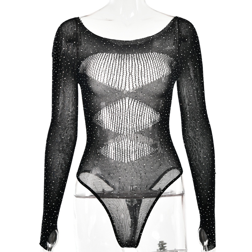 European And American Autumn Sexy Hot Girl High Elastic Knitted See-through Long Sleeve Hollow Hot Diamond Jumpsuit Female