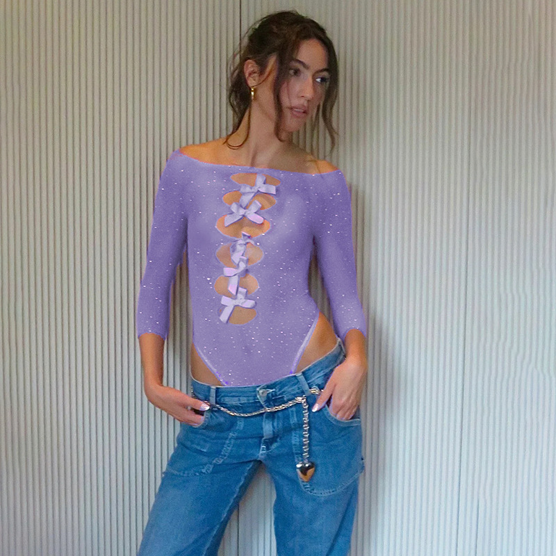 European And American Autumn Sexy Hot Girl High-elastic Knitted See-through Bow Hollow Hot Diamond Jumpsuit