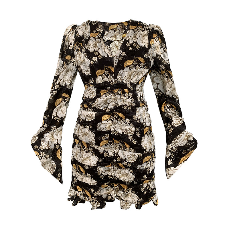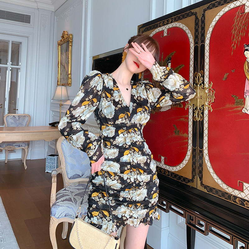 French Retro Elegant Begonia Printed Puff Sleeve Pleated Dress Small Butt Covering Floral Skirt4731