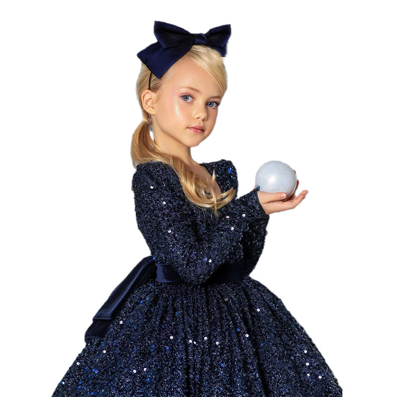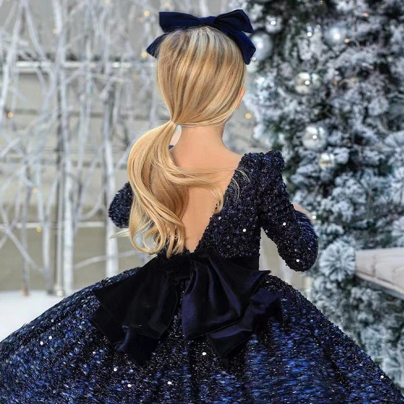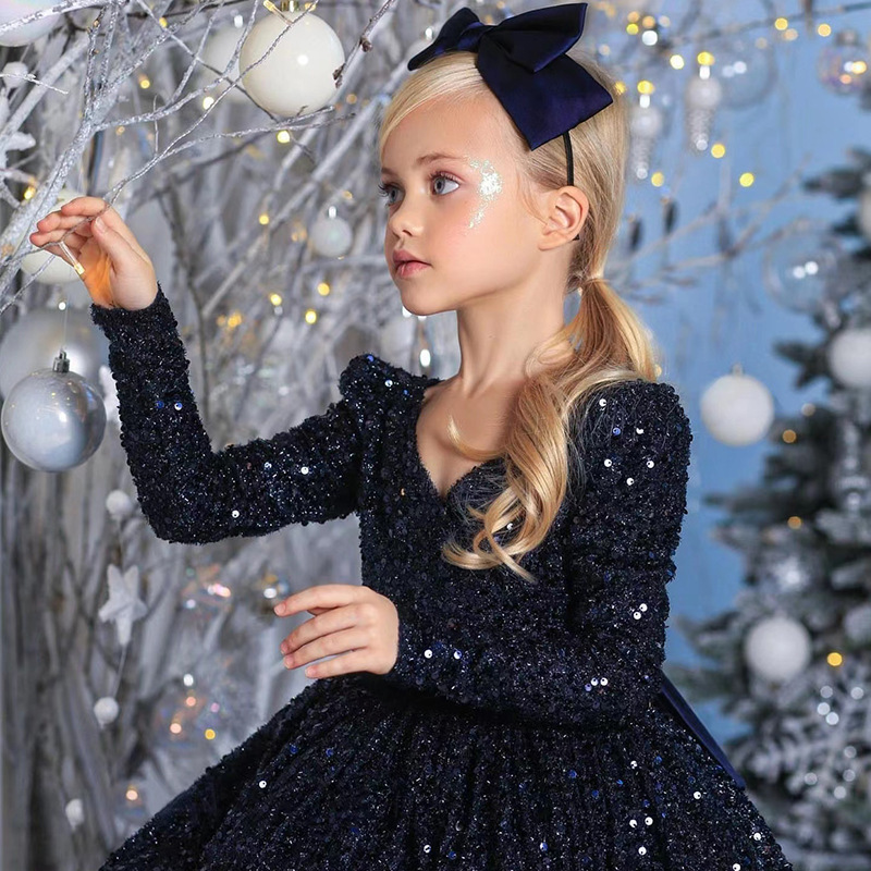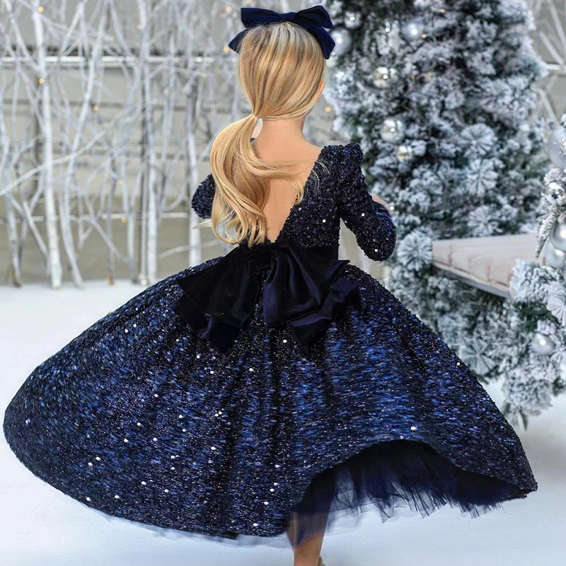 Children's Dress Princess Dress Blue Flower Girl Long-sleeved Tulle Dress Little Girl Backless Birthday Party Sequin Dress