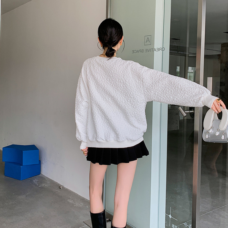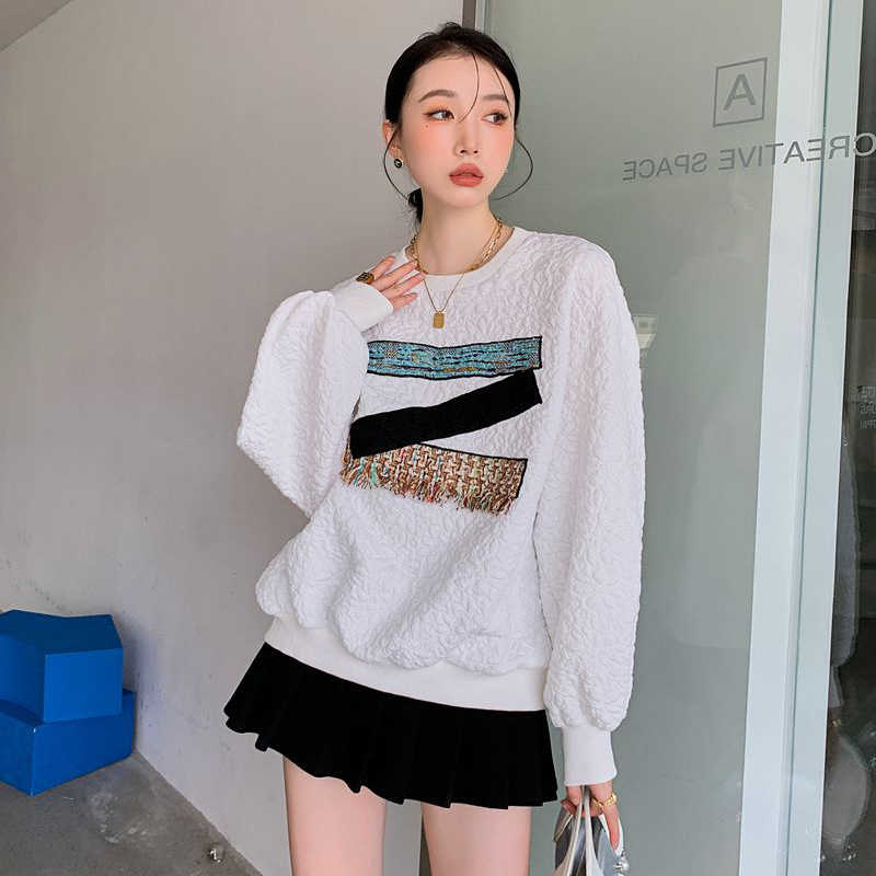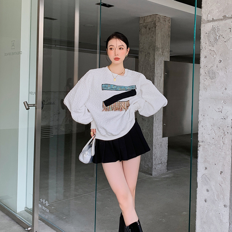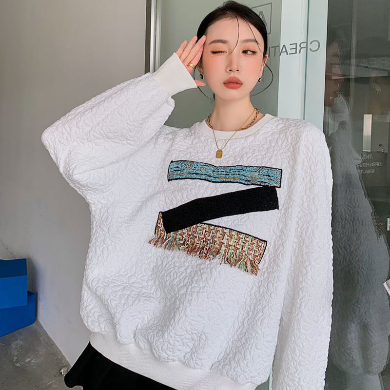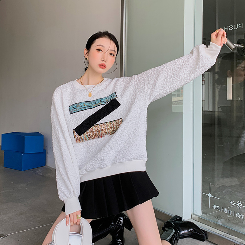 Designed Asymmetric Patchwork Patchwork Contrasting Sweatshirt Women's Round Neck Textured Long-sleeved Loose Coat Autumn