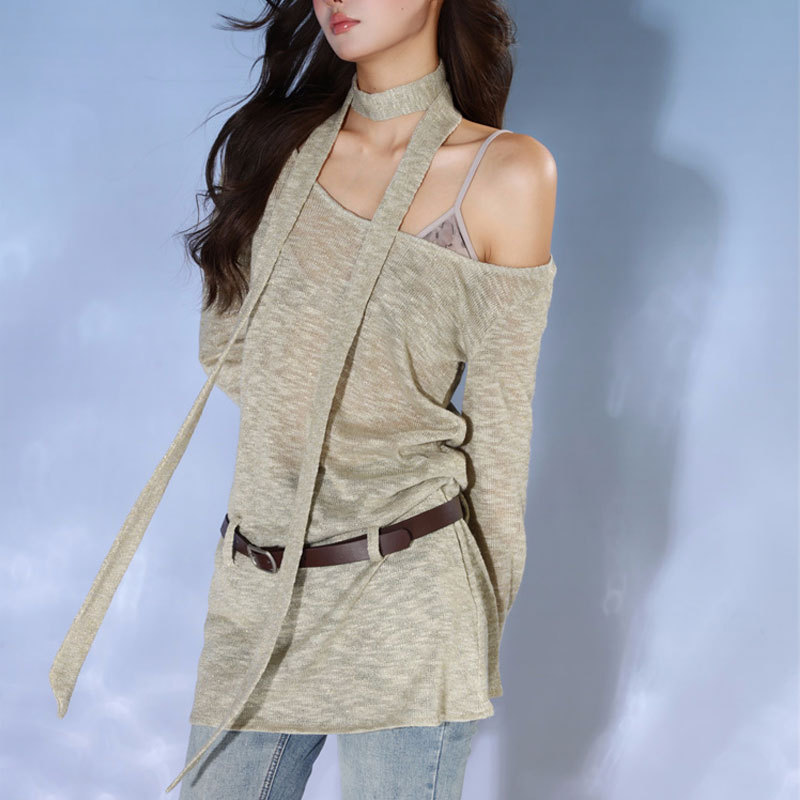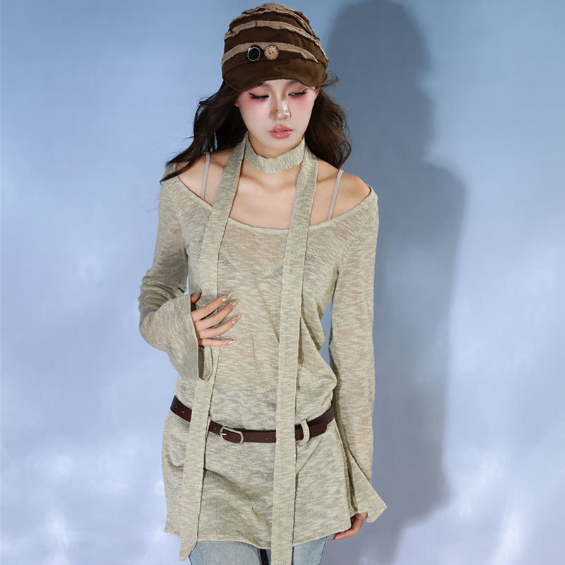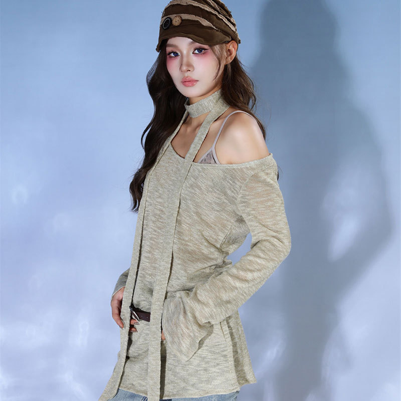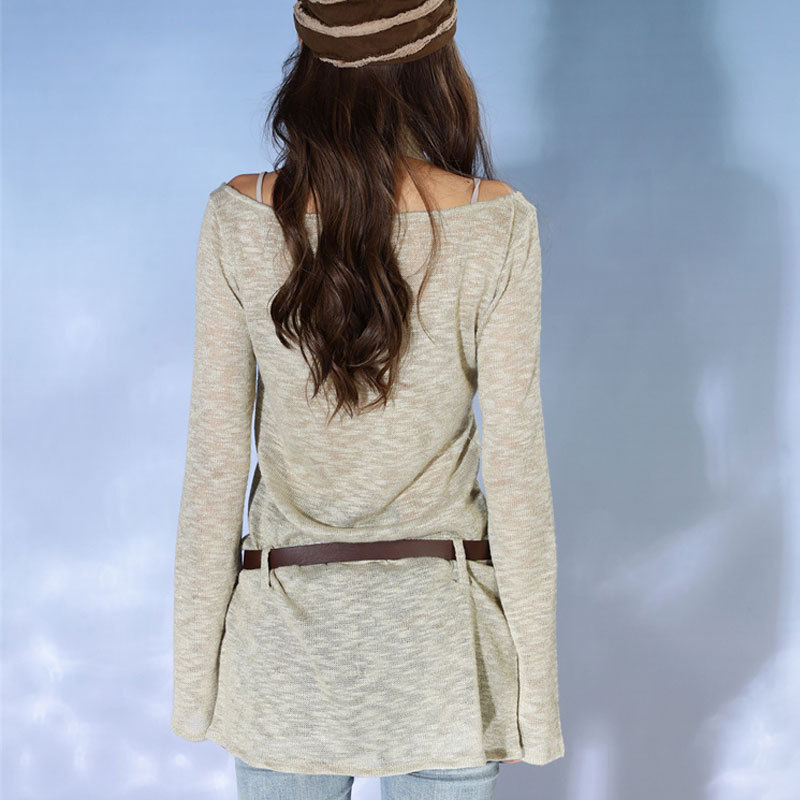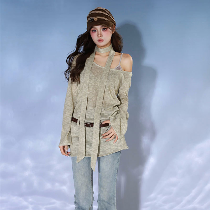 T-shirt Women's Autumn Design Niche Retro Loose Slim One-line Collar Thin Casual Long-sleeved Top Style