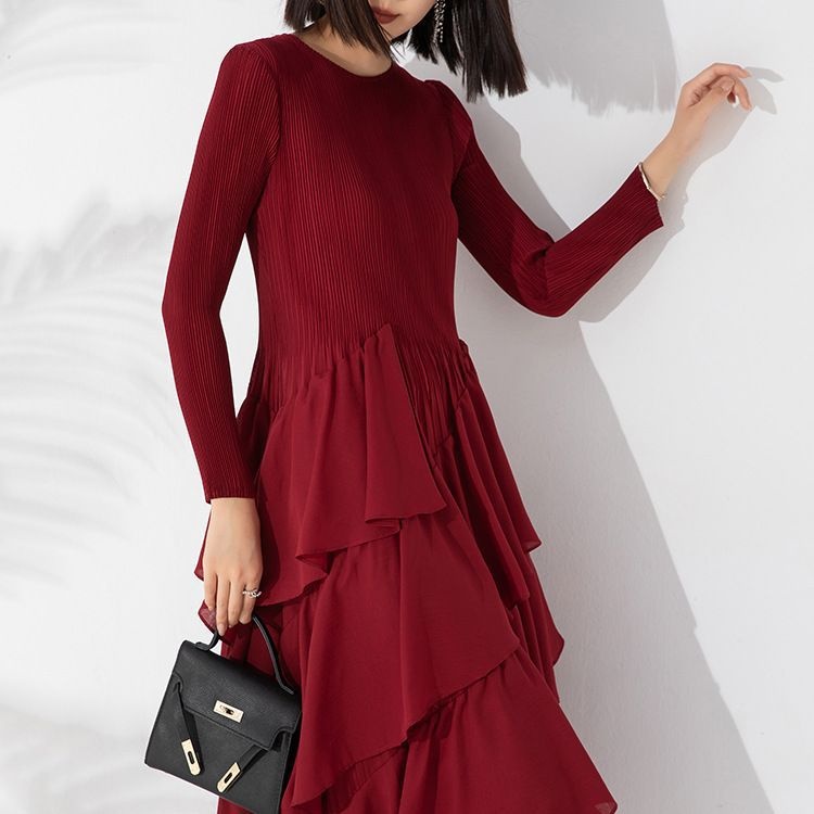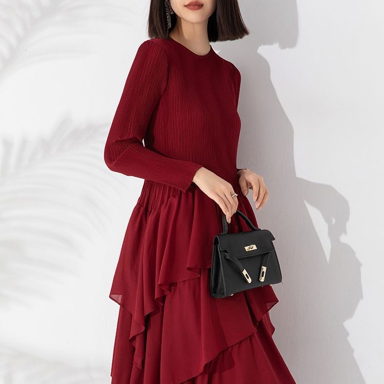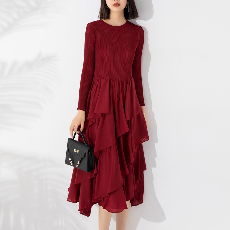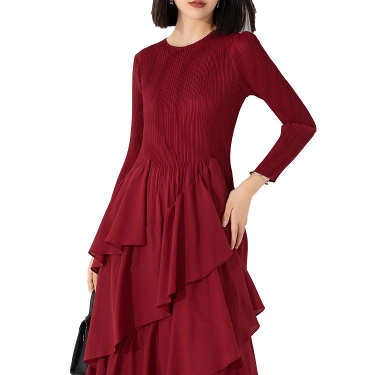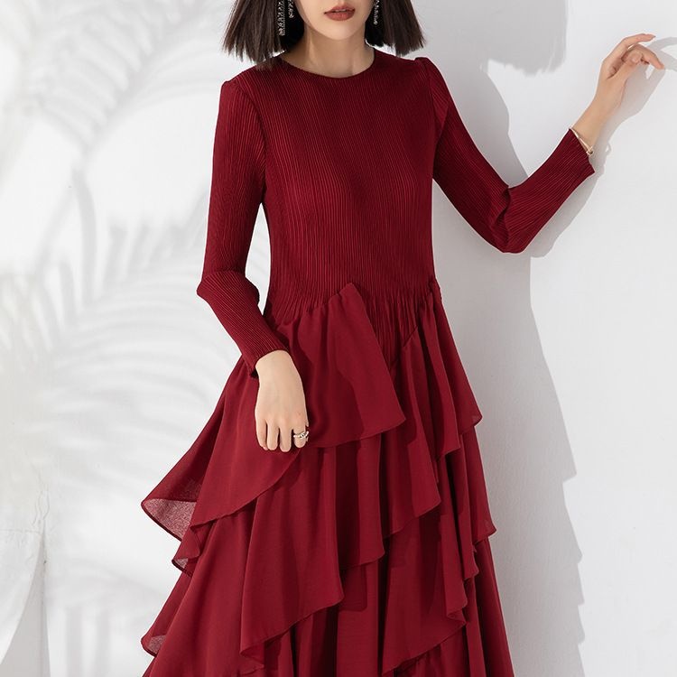 Autumn And Winter Women's Dress Style Loose And Slim Solid Color Round Neck Long Sleeve Pleated Cake Skirt