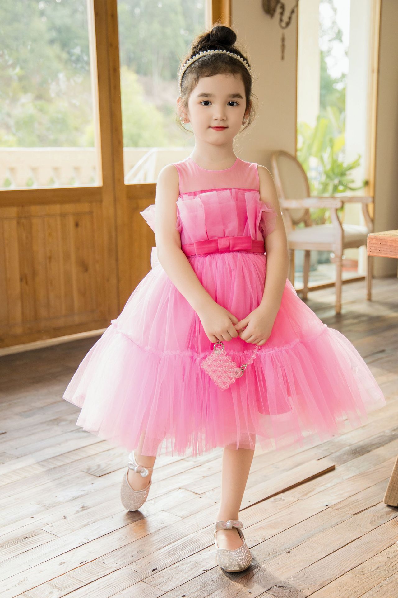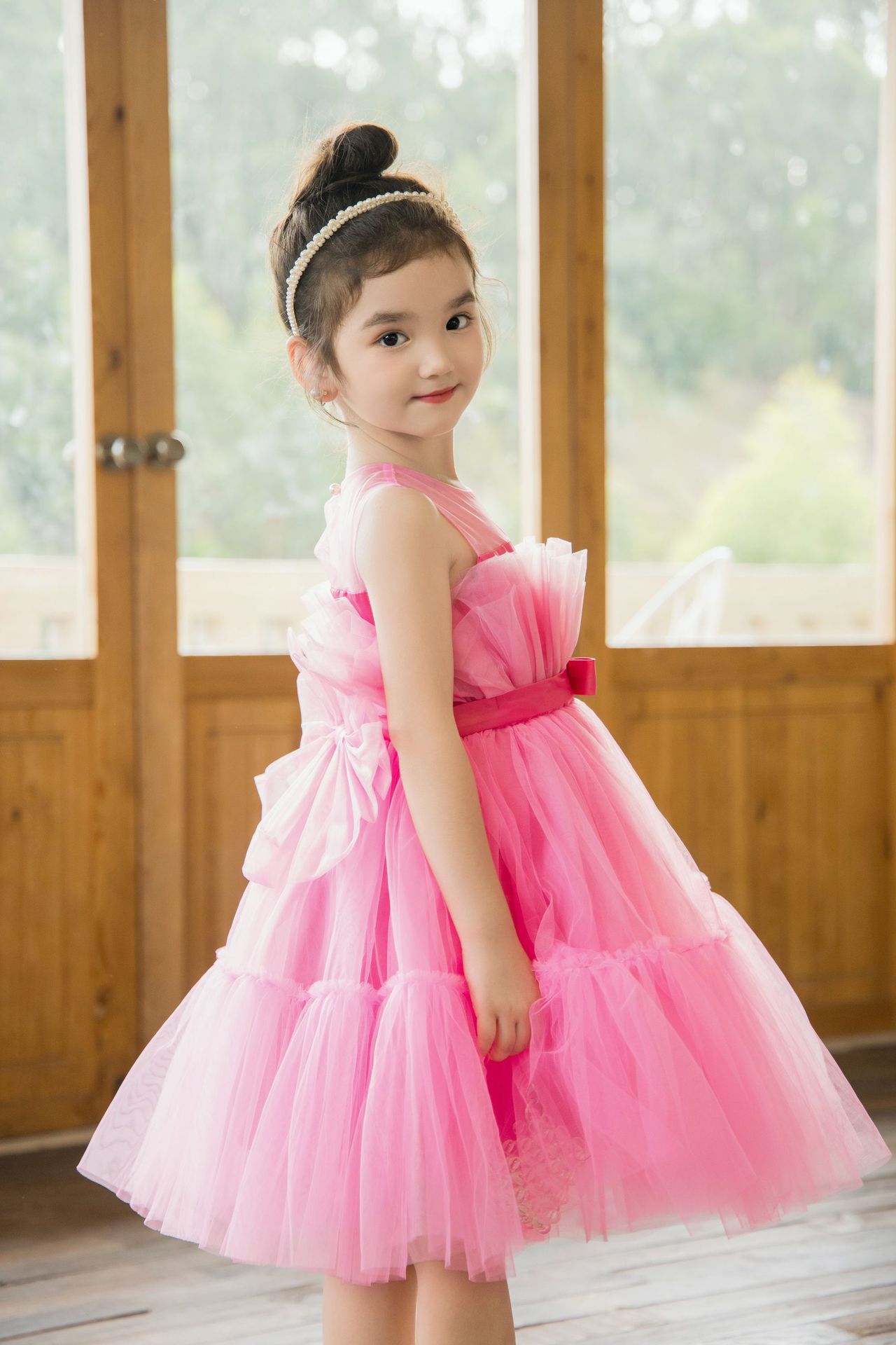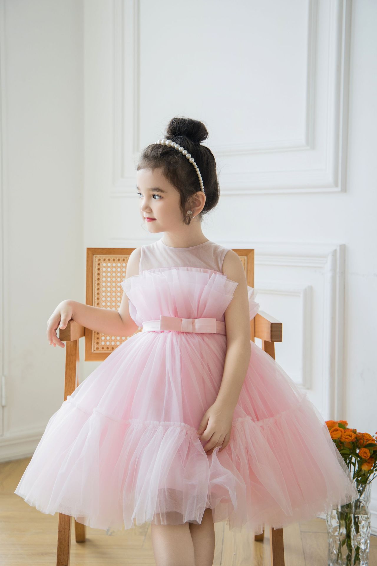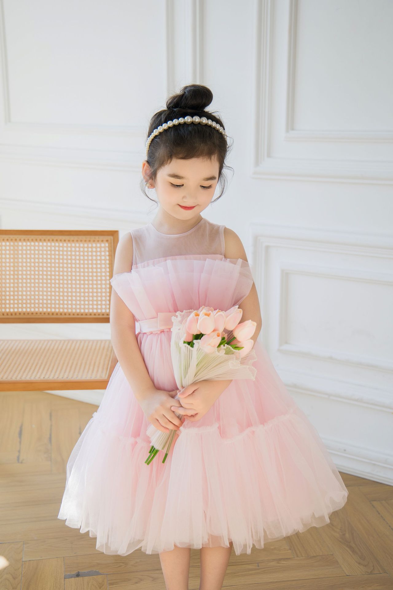 Girls Removable Bow Dress Dress Catwalk Dress Flower Girl Wedding Tutu Skirt Host Performance Dress