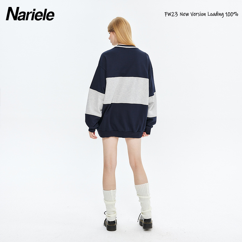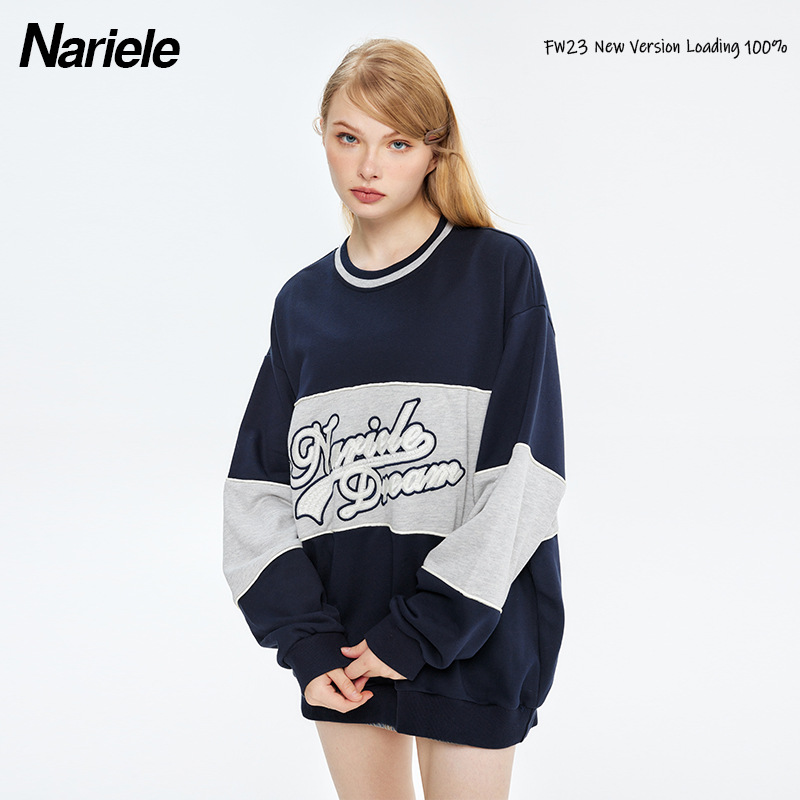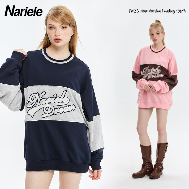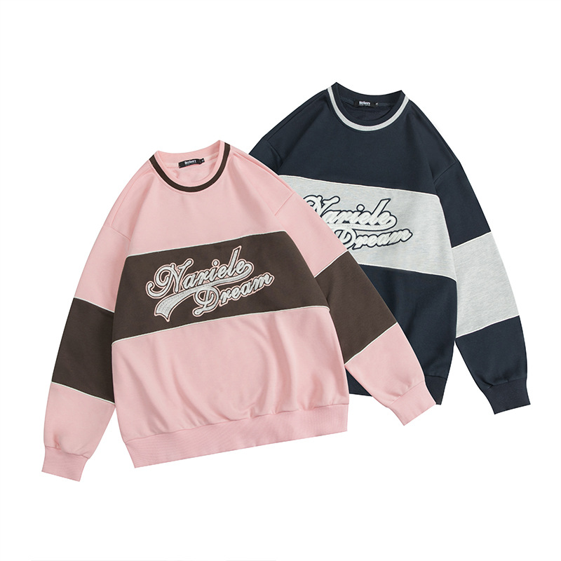 Hey Henry European And American Loose Stitching Embroidery Round Neck Sweatshirt Men's Couple Bf Autumn Terry Tops Women