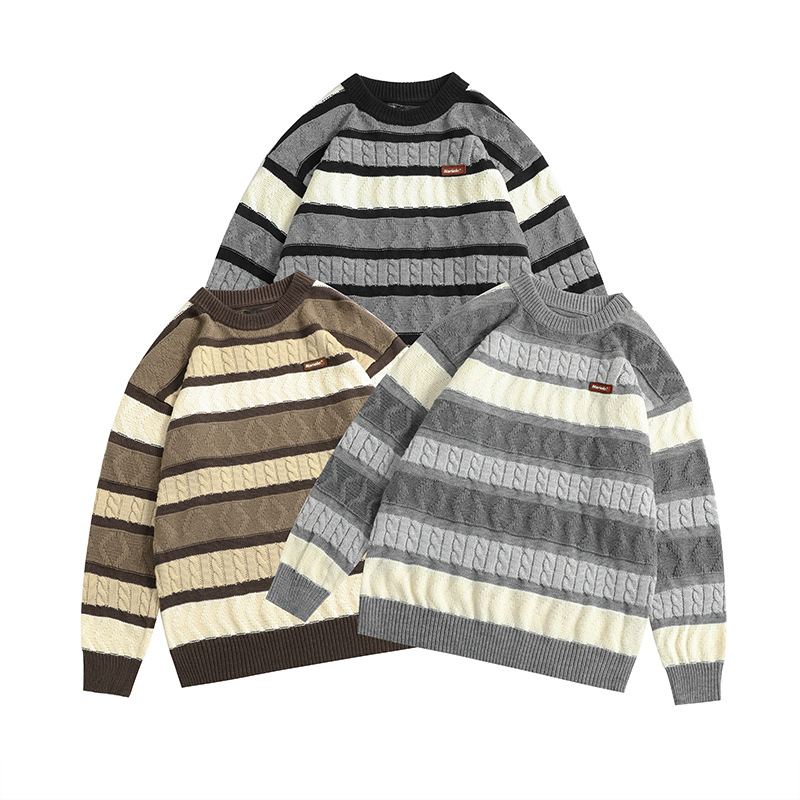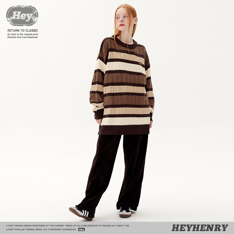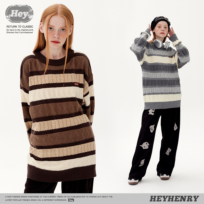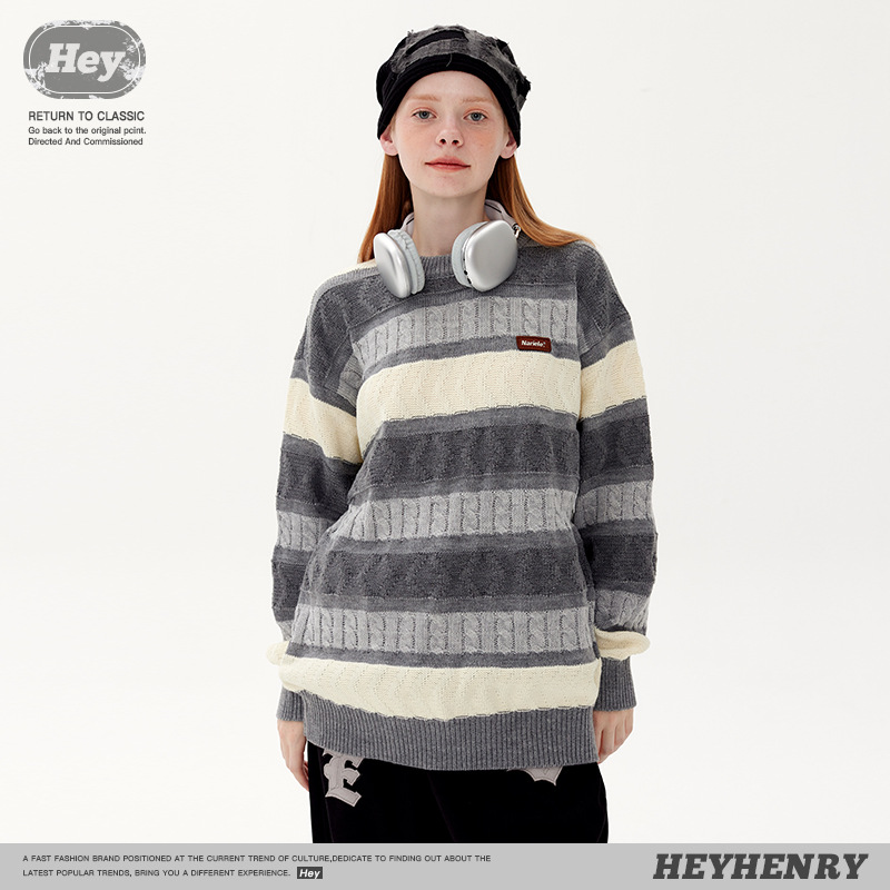 Hey Henry Japanese Retro Jacquard Contrast Striped Sweater Round Neck Sweater For Men And Women Loose Couple Casual