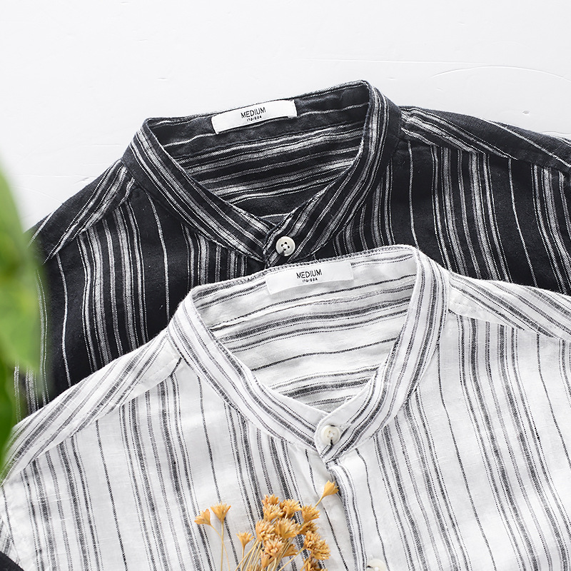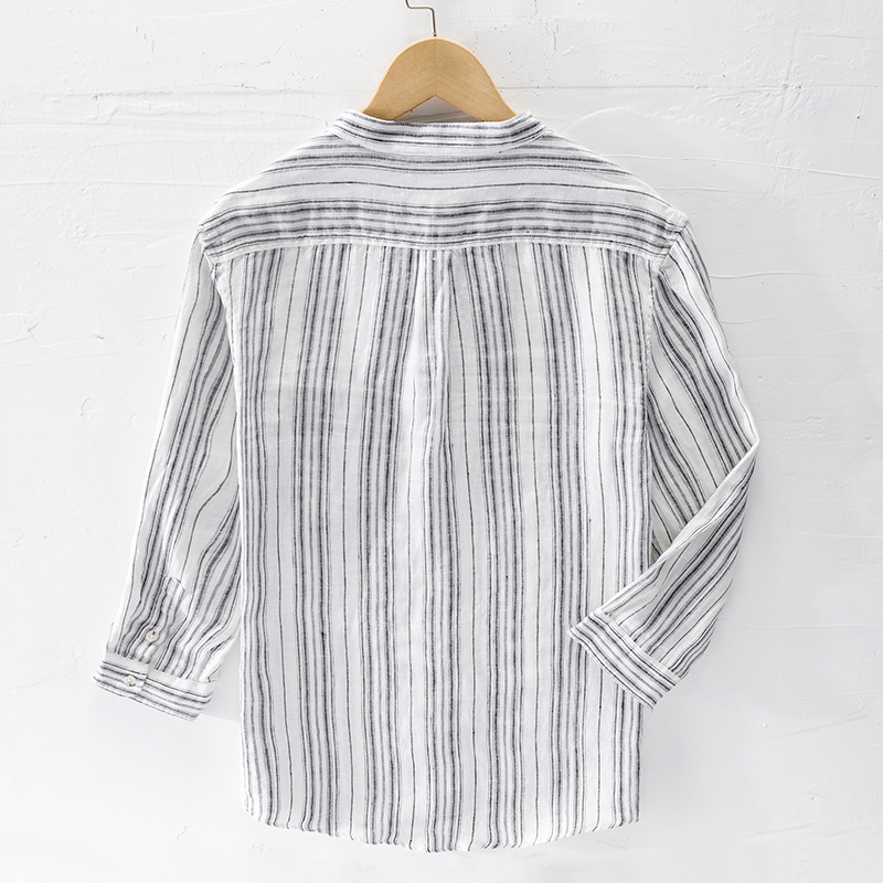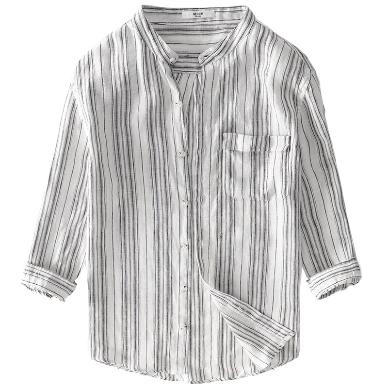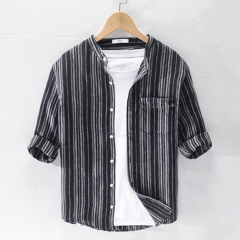 Summer Men's Linen Three Quarter Sleeve Striped Shirt Stand Collar Casual Beach Sun Protection Casual Shirt For Men