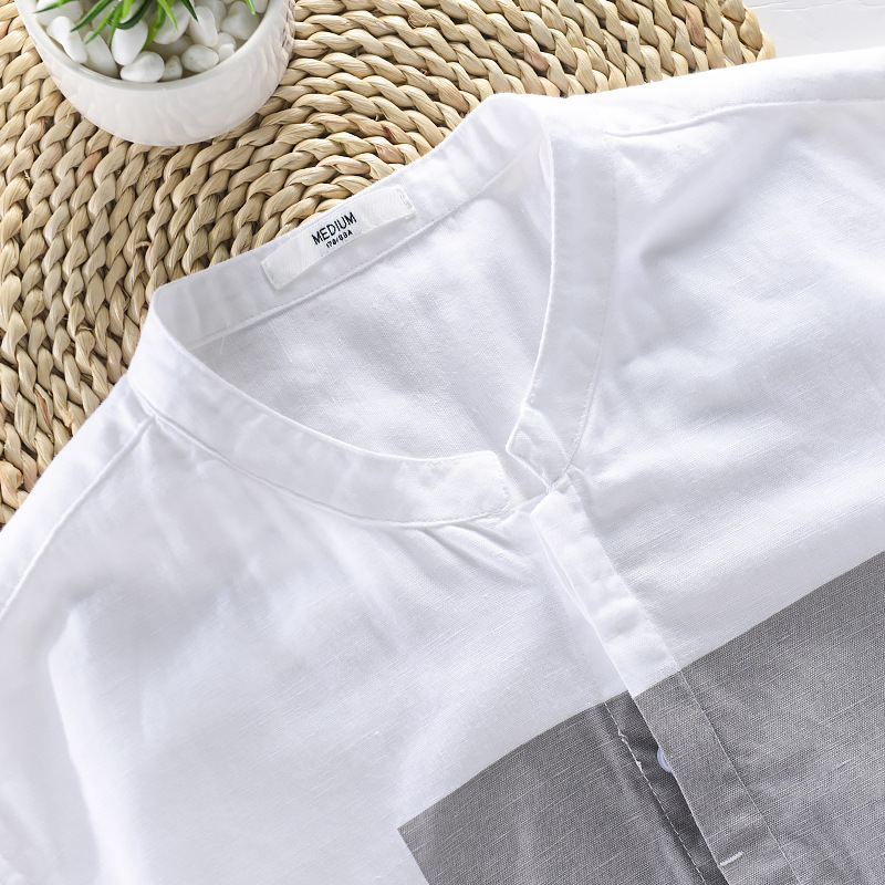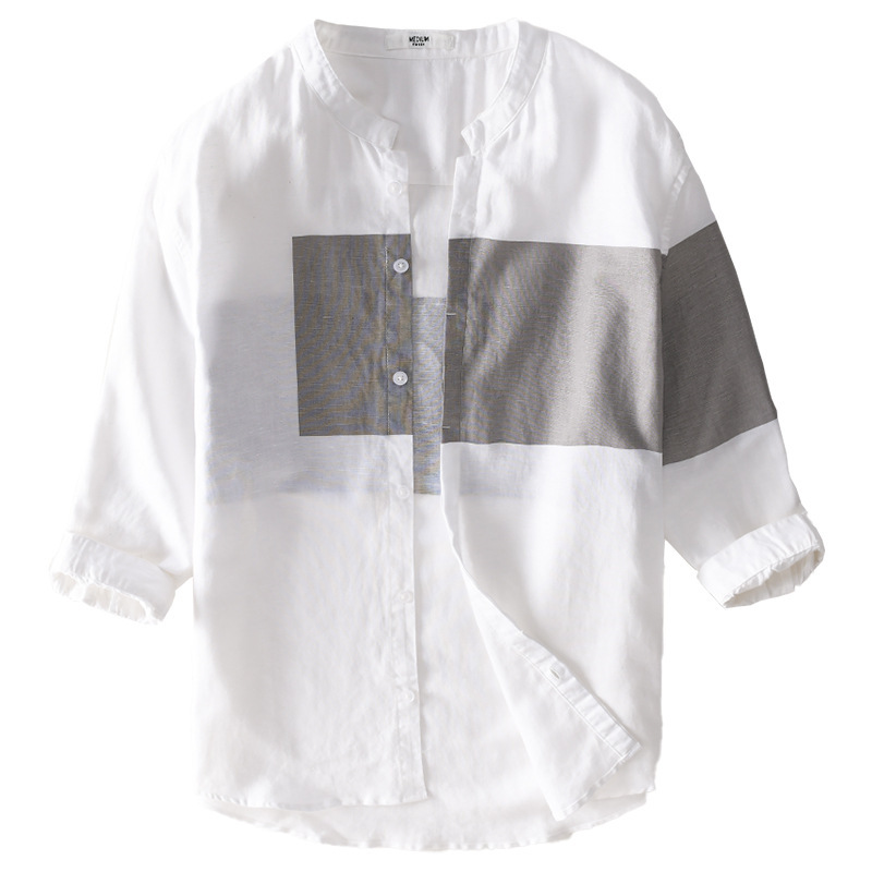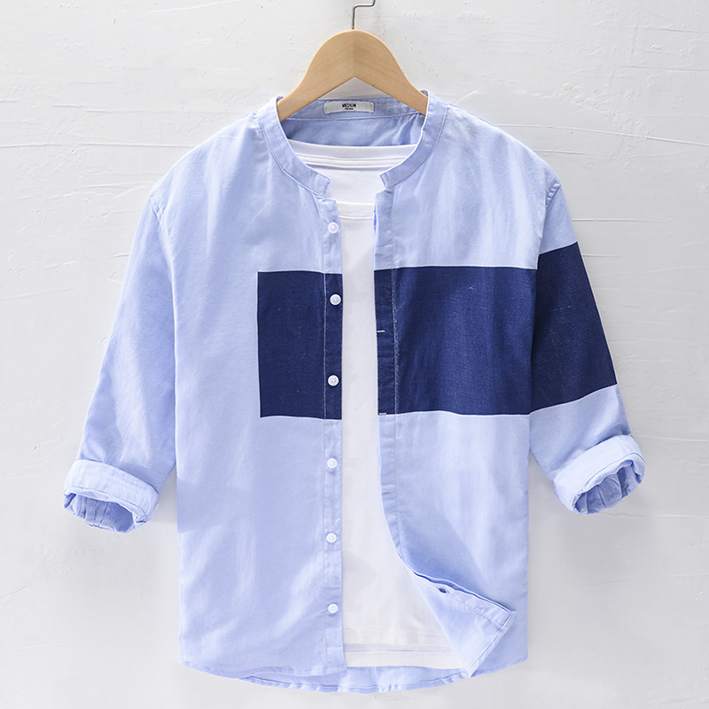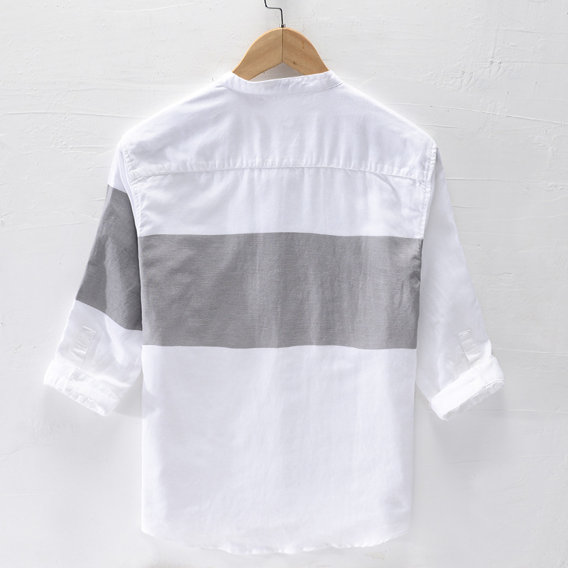 Men's Cotton And Linen Color Matching Casual Stand-up Collar Shirt Three-quarter Sleeve Youth Linen Shirt Comfortable And Breathable One-piece Hair