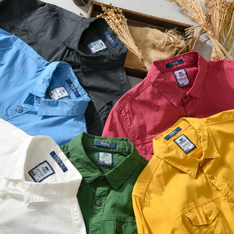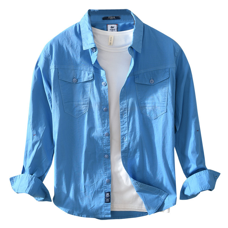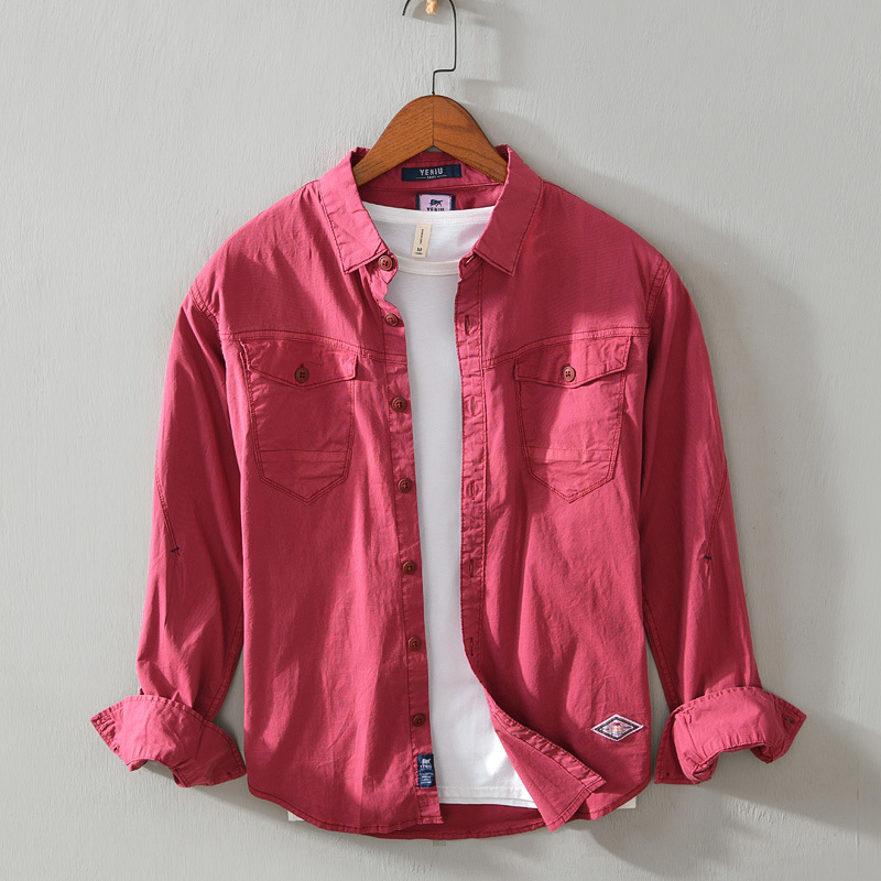 Men's Long-sleeved Cotton Shirt Japanese Retro Solid Color Overalls Men's Youth Hong Kong Style Casual Pocket Lapel Jacket