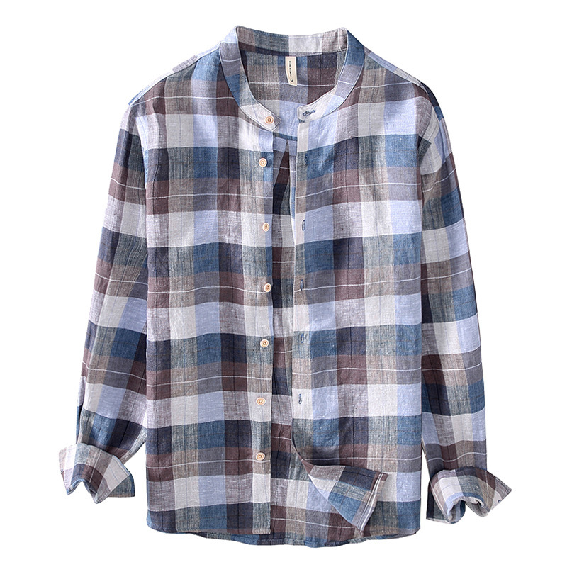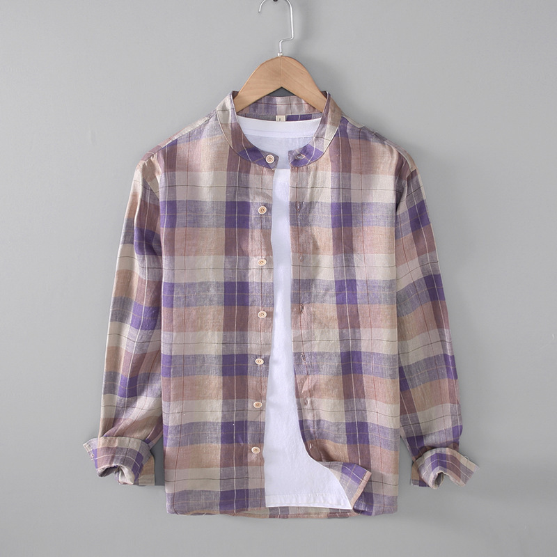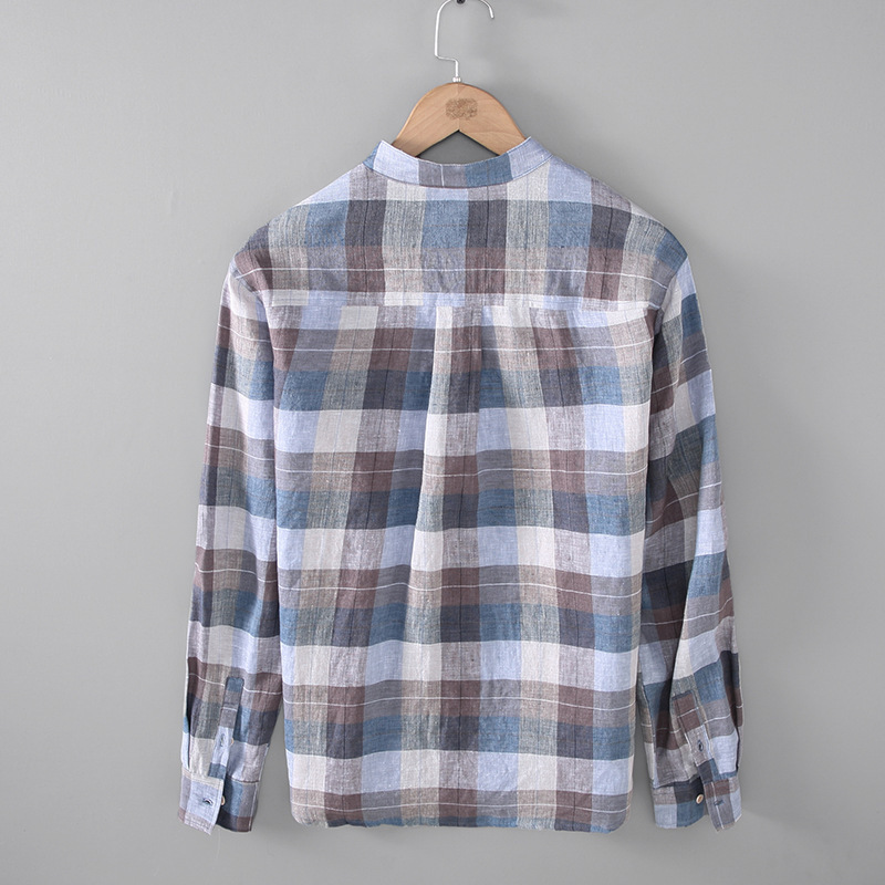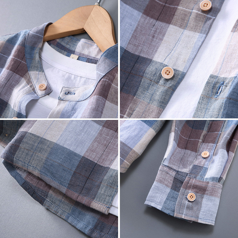 JM282 Linen Stand Collar Loose Casual Plaid Linen Cotton Shirt Long Sleeve Men's Linen Shirt