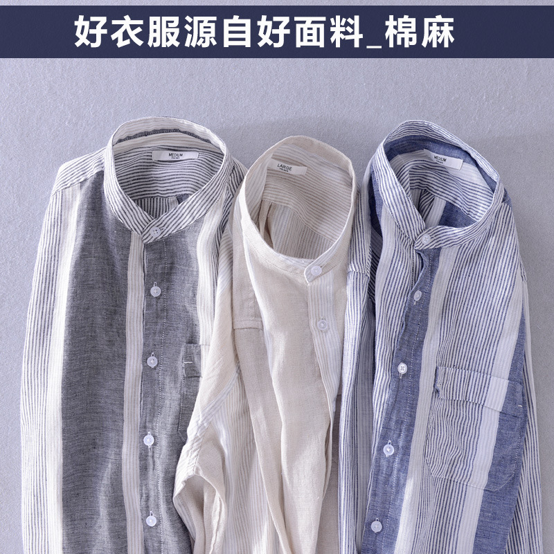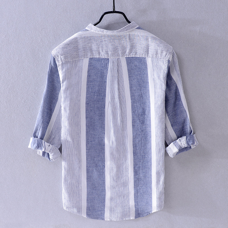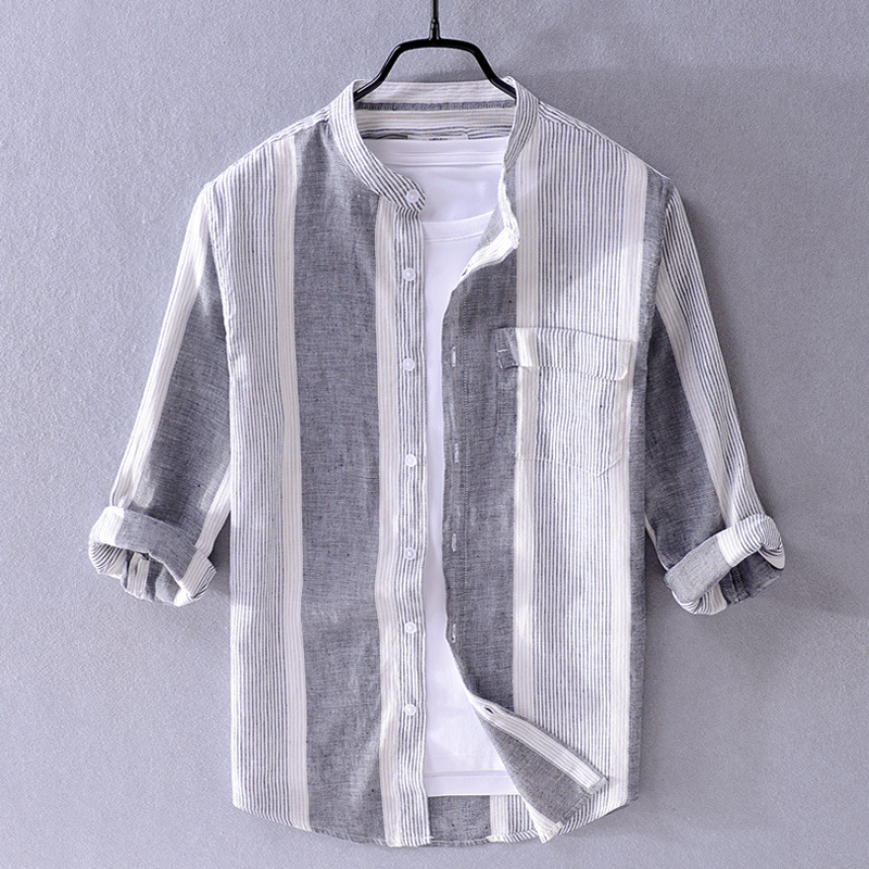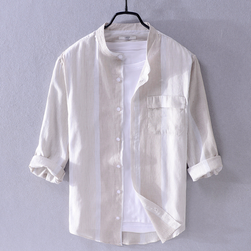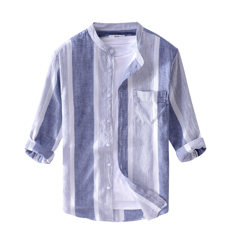 Ethnic Style Men's Cotton And Linen Three-quarter Sleeve Shirt Striped Stand Collar Linen Casual Shirt Chinese Style Men's One Piece Hair