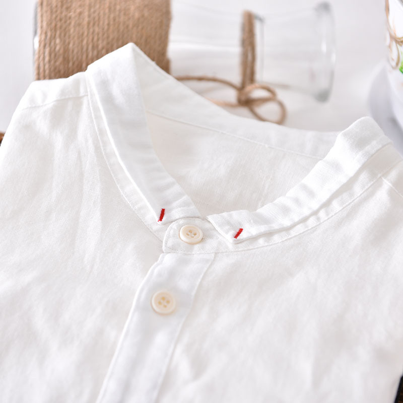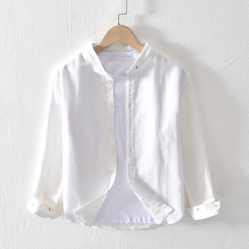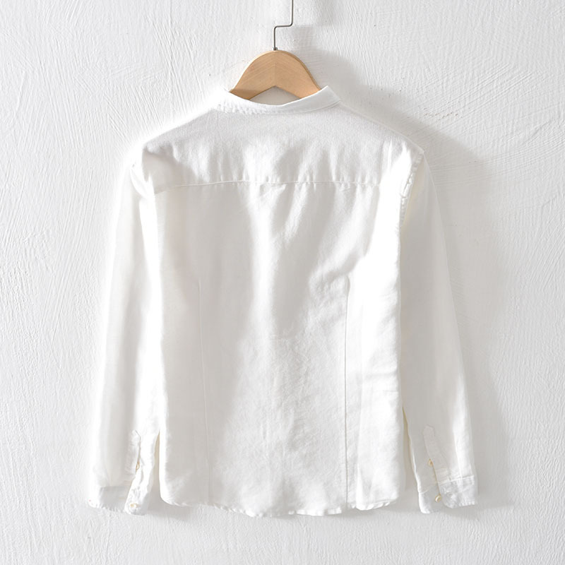 Men's Spring Classic Long-sleeved Shirt Linen Stand Collar White Solid Color Casual Cotton And Linen Blended Shirt For Young Men