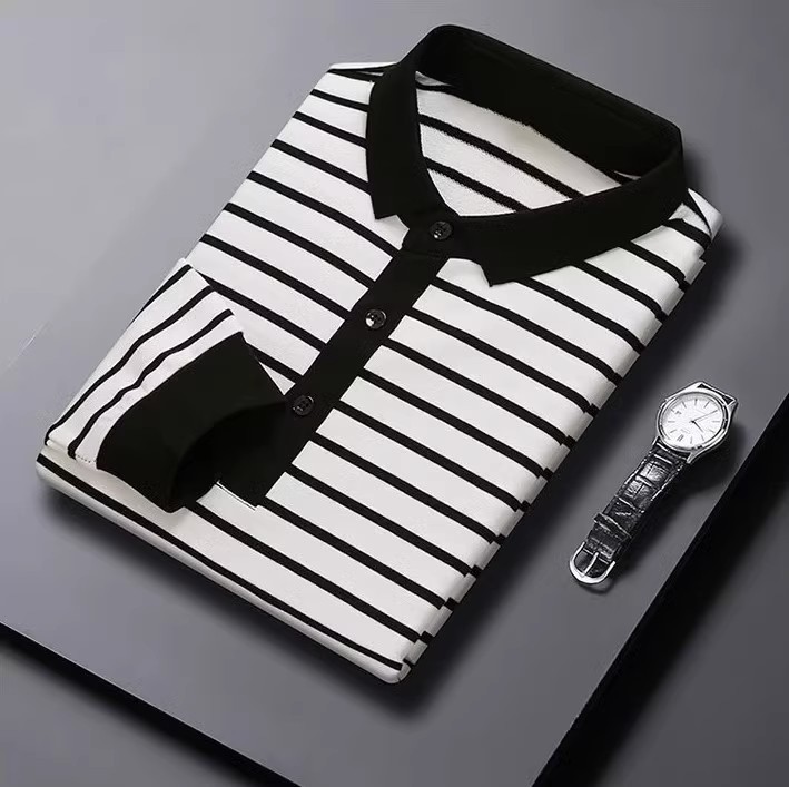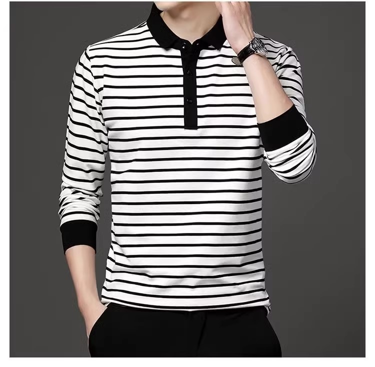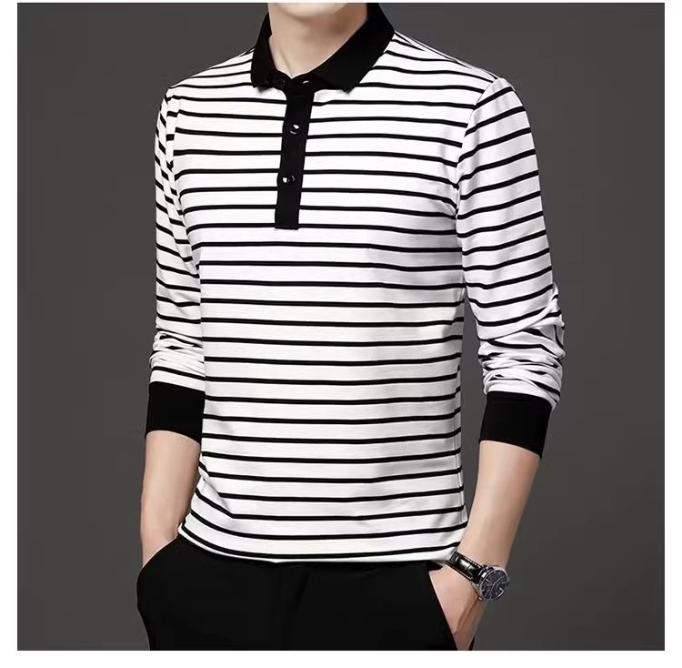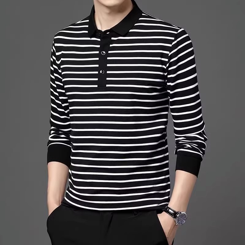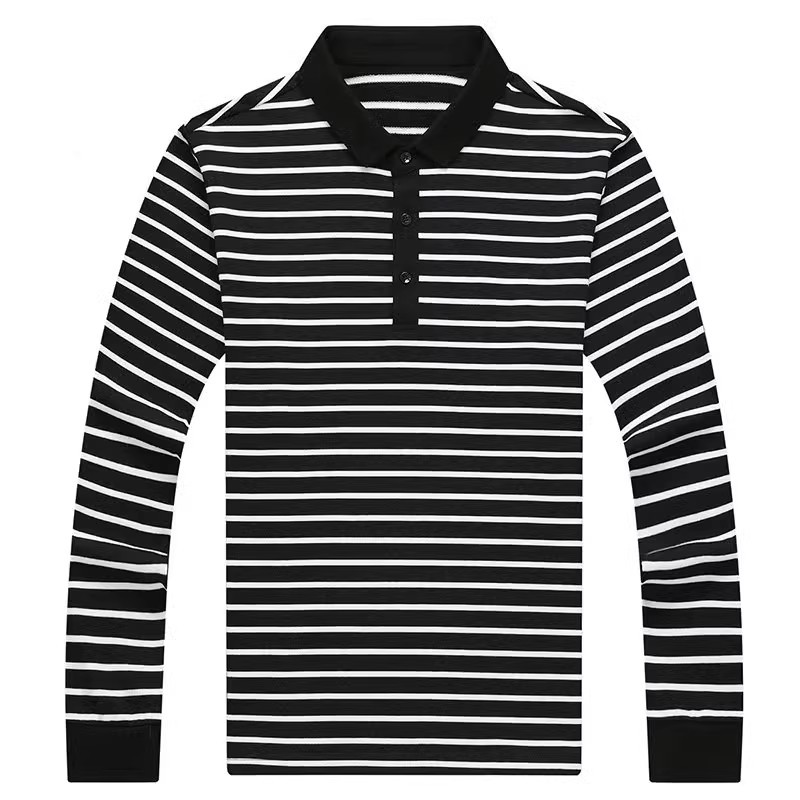 Straight Hair Cut Standard Foreign Trade American Retro Polo Shirt Men's Business Spring And Autumn Large Size Striped Long-sleeved T-shirt