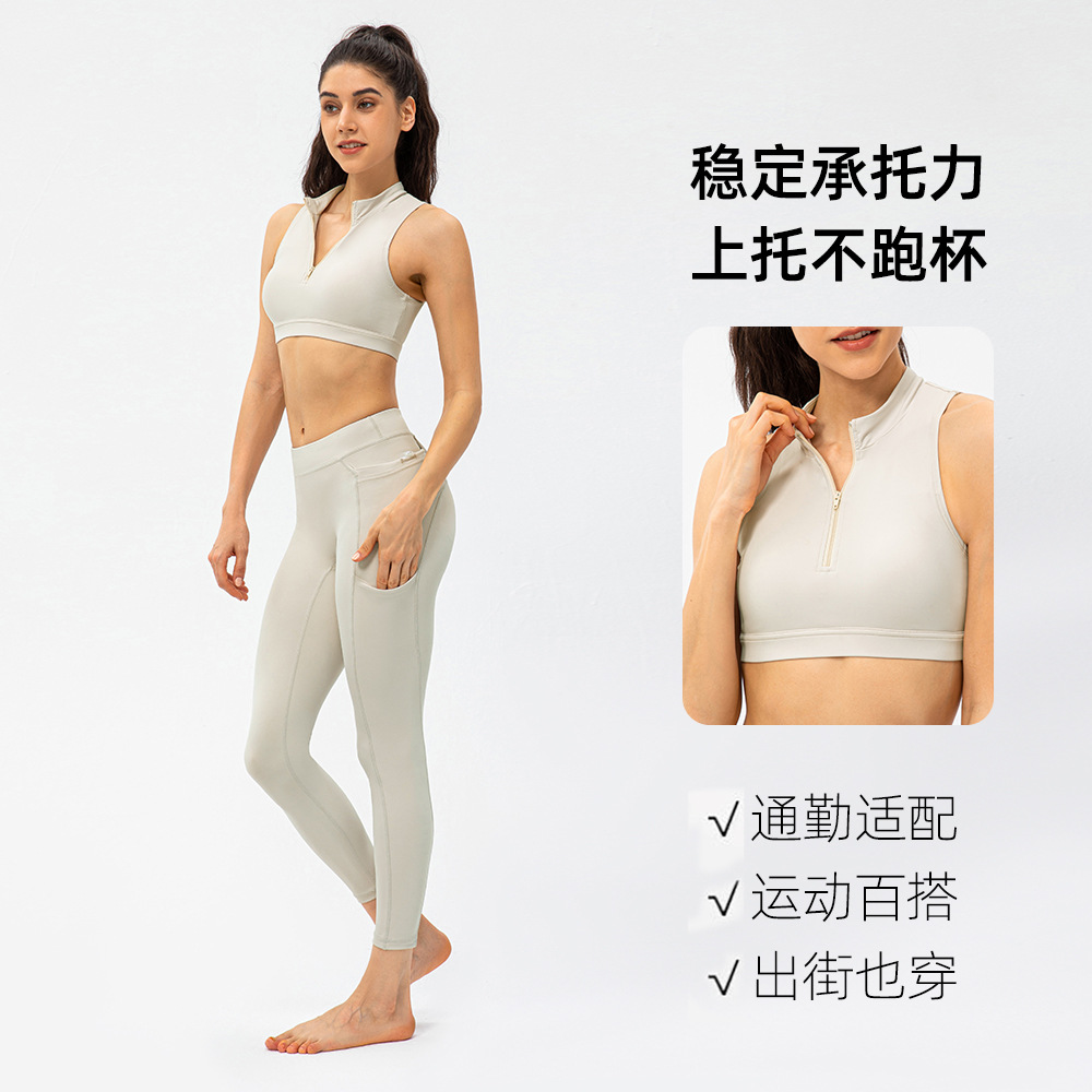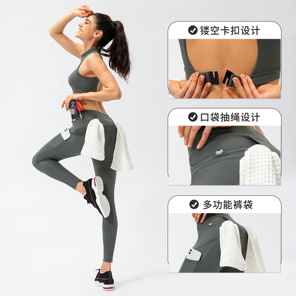Spring And Summer Women's Yoga Suit Two-piece Set High Waist Sports Vest With Chest Pad Nude Tights Multi-pocket Fitness Suit