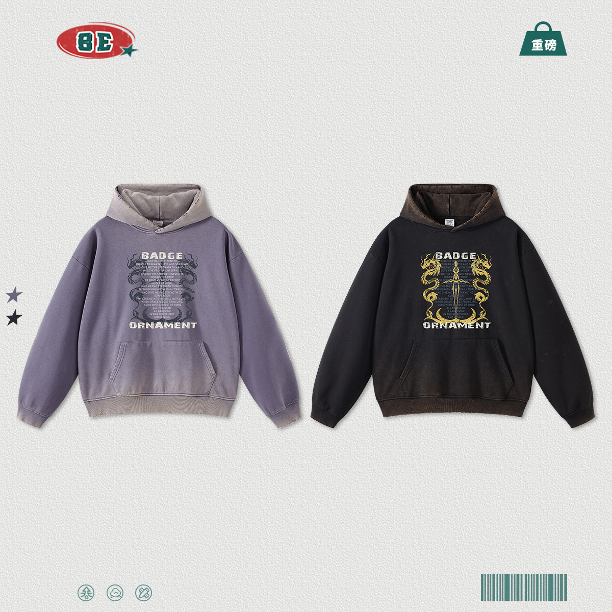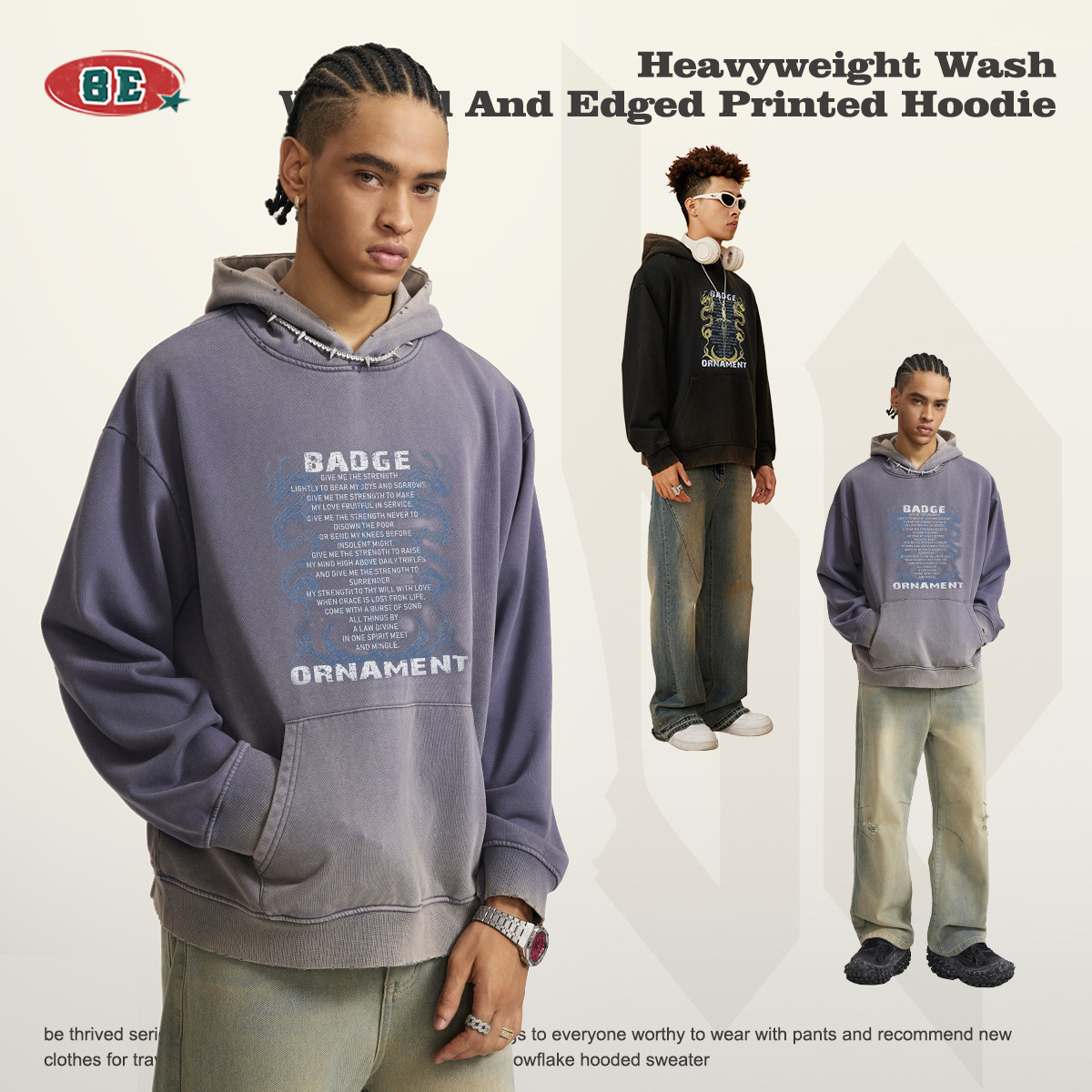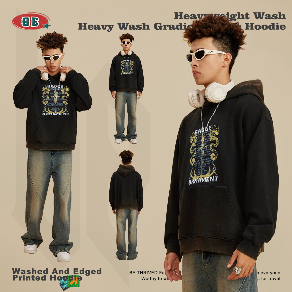 BEMen's Wear Autumn And Winter National Heavy Washed Frayed Printed Hooded Sweatshirt Men's Loose High Street Fashion Brand Hoodie