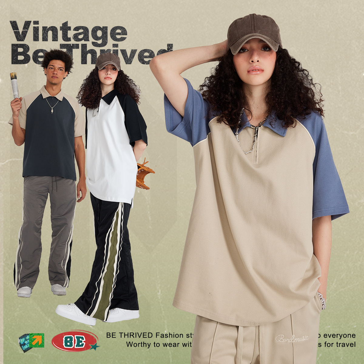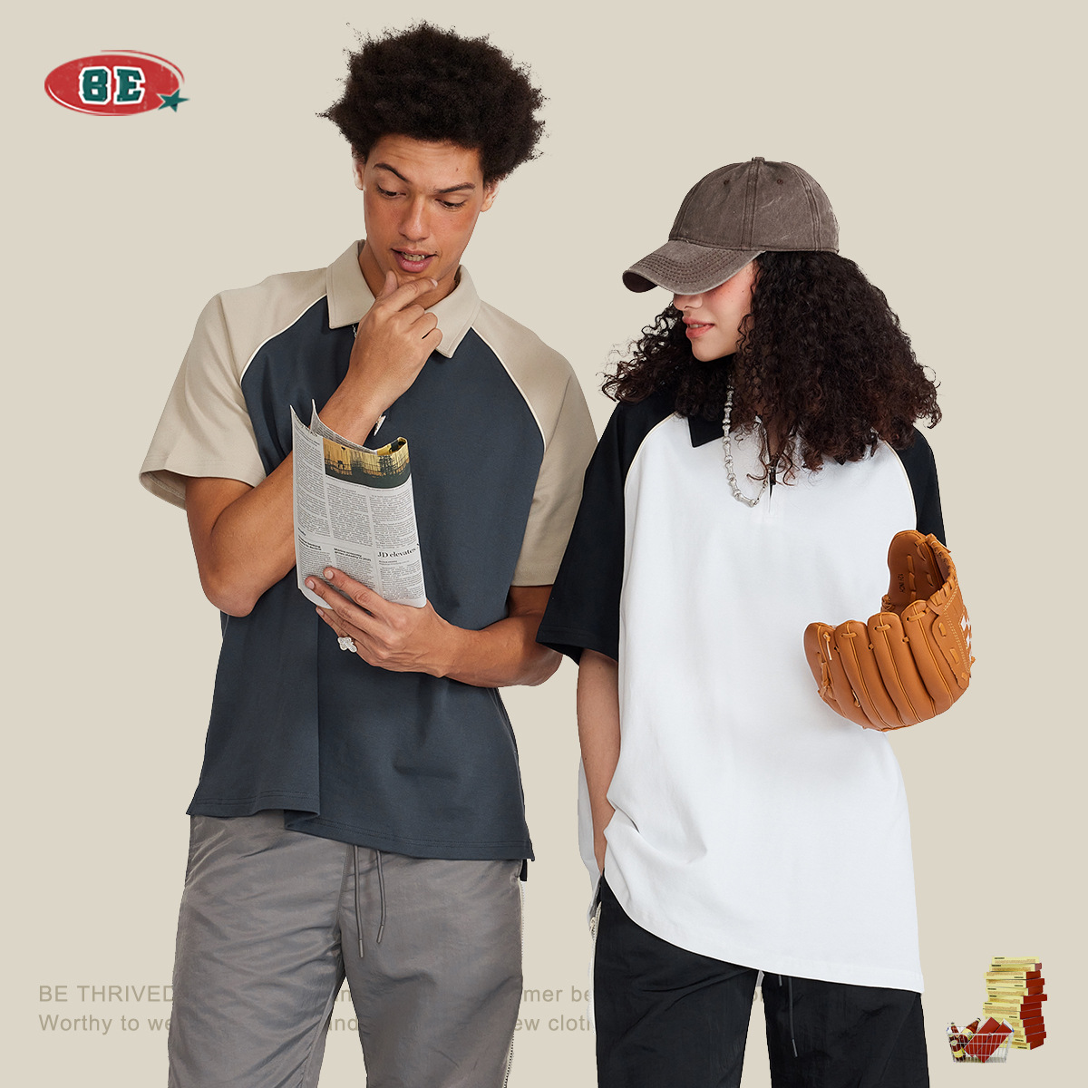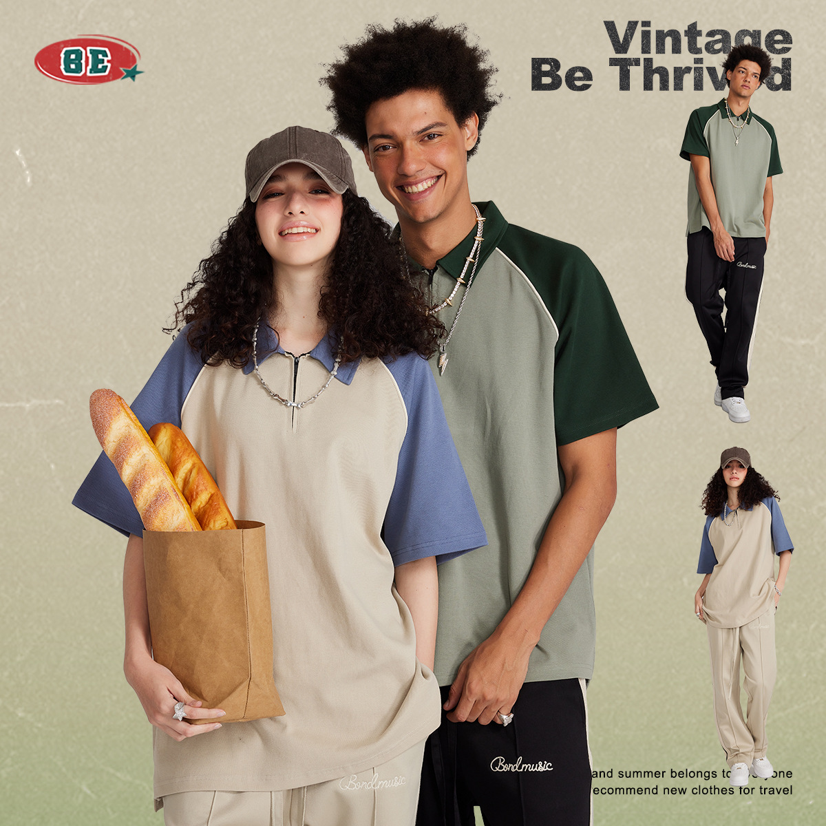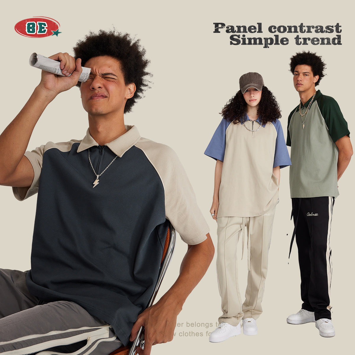 BEMen's Wear|Spring And Summer250 GAmerican Contrasting Raglan Slit Polo Collar Short-sleeved Retro Loosey Brand T-shirt