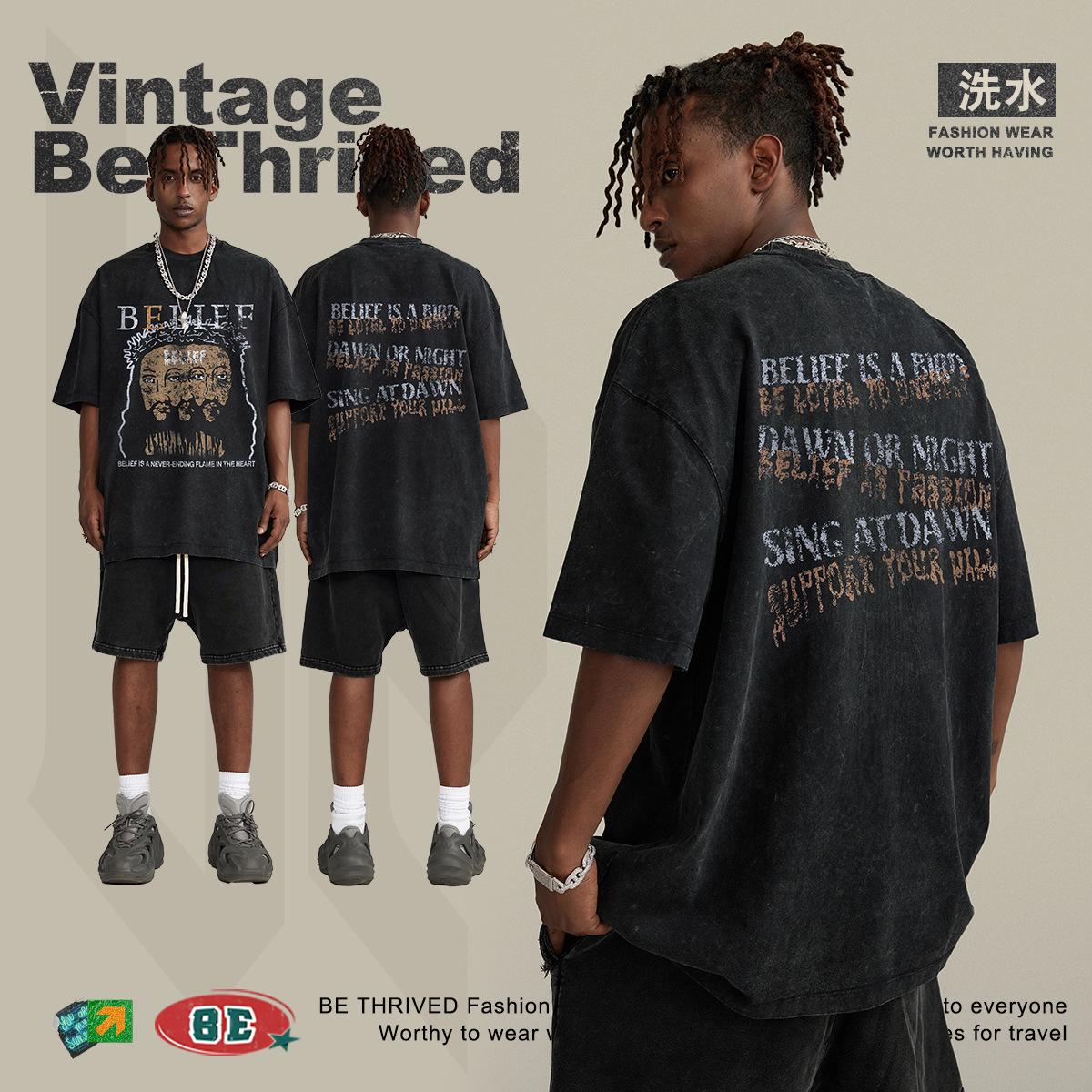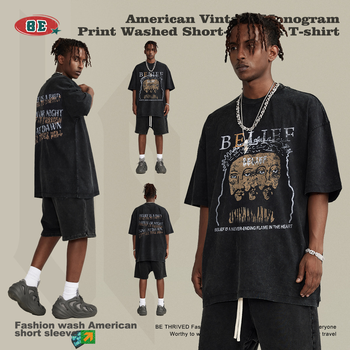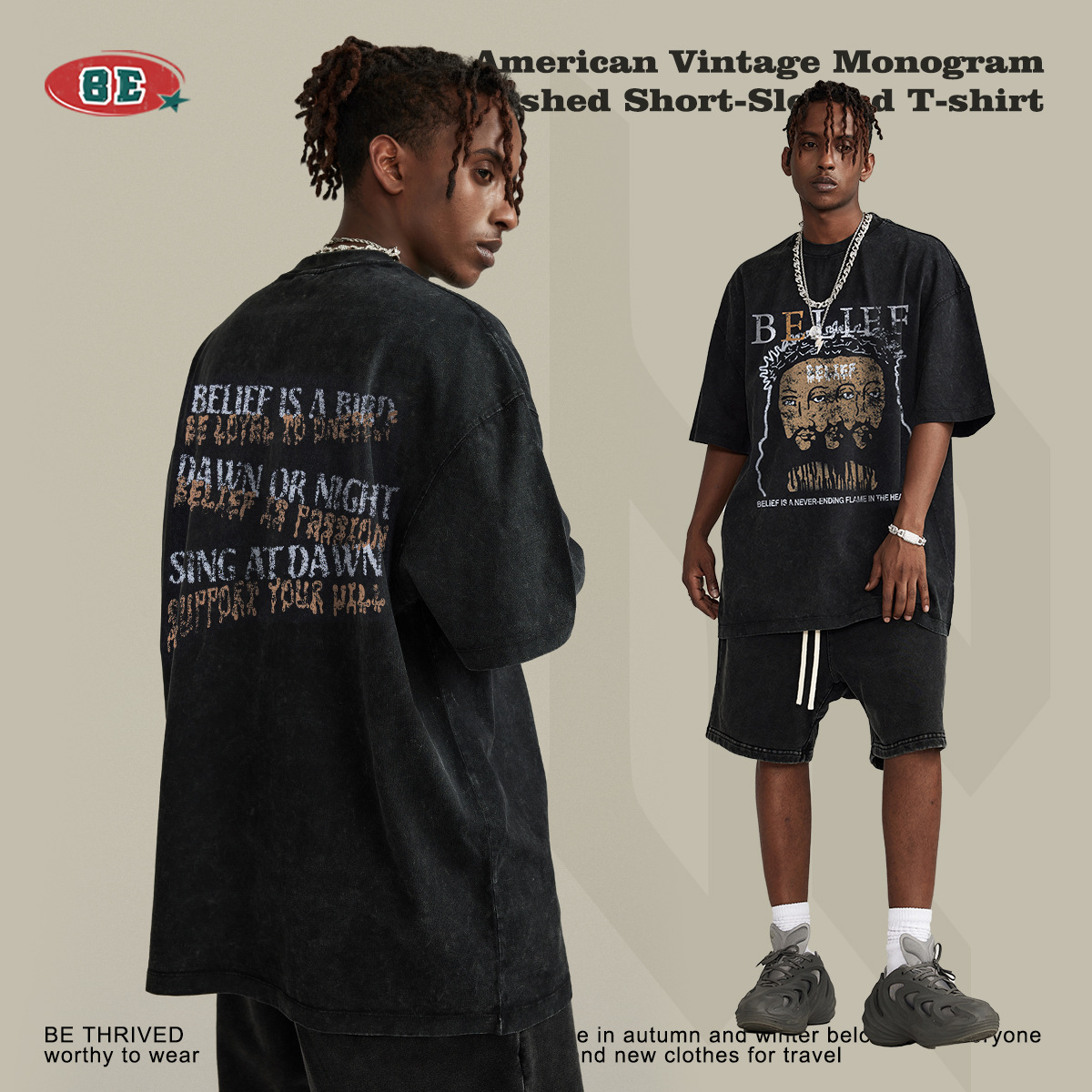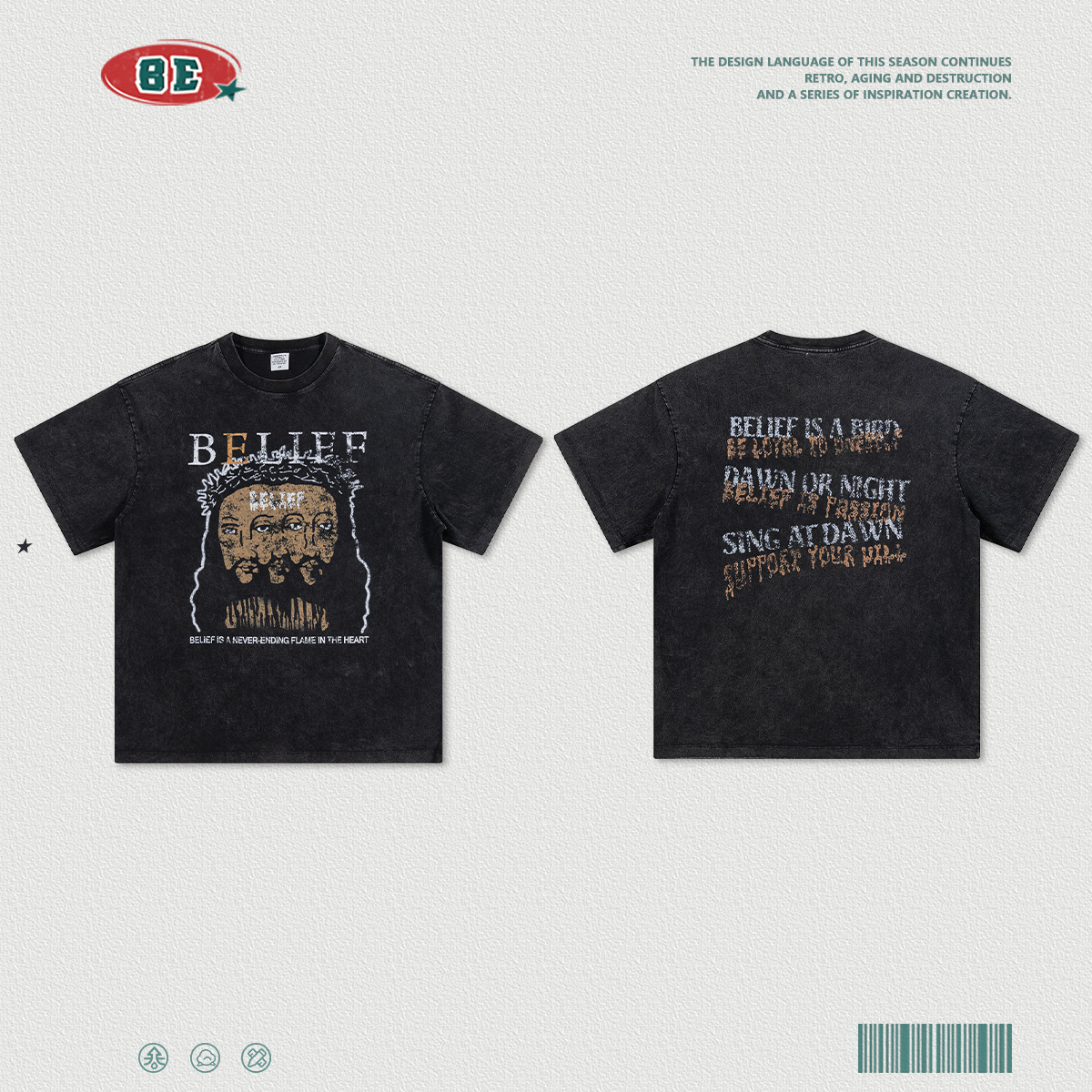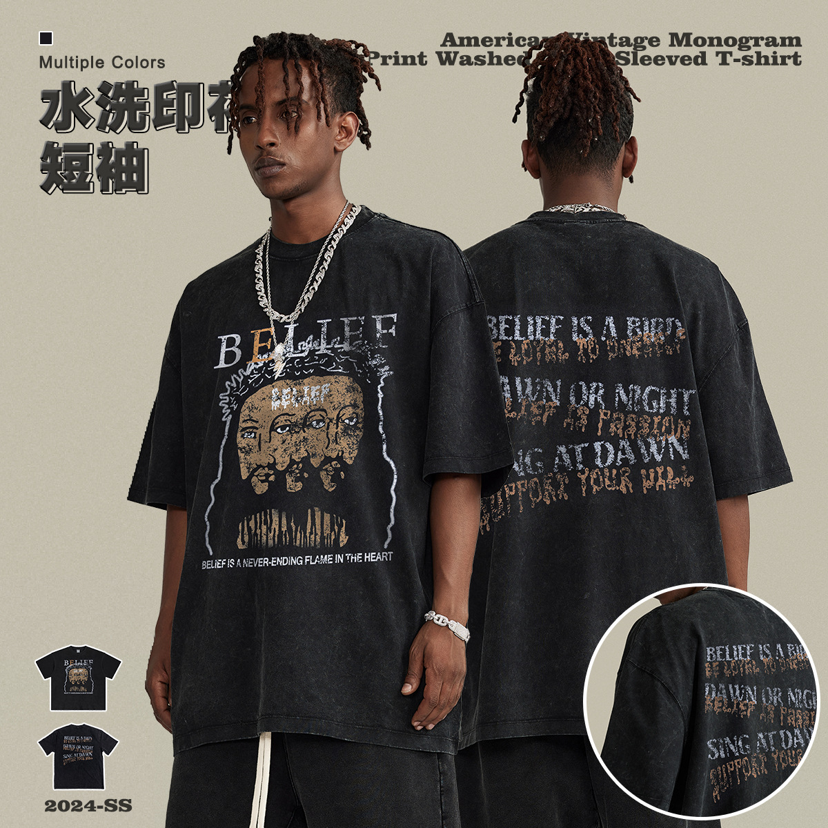BEMen's Wear|Spring And Summer Retro Washed Jesus Print Round Neck Short Sleeve American Street Fashion Brand Loose Cotton T