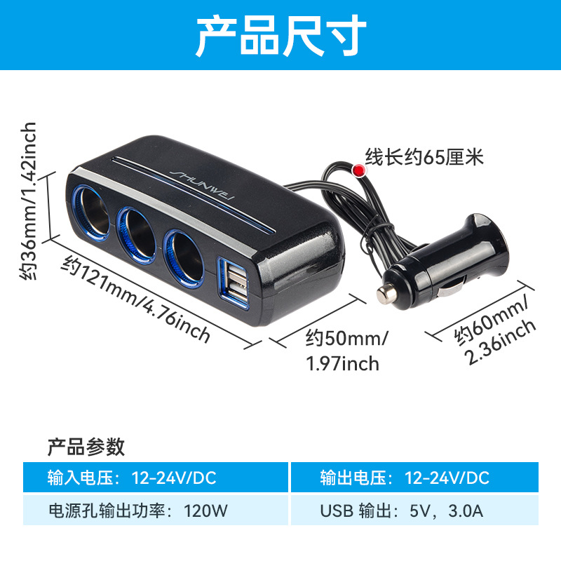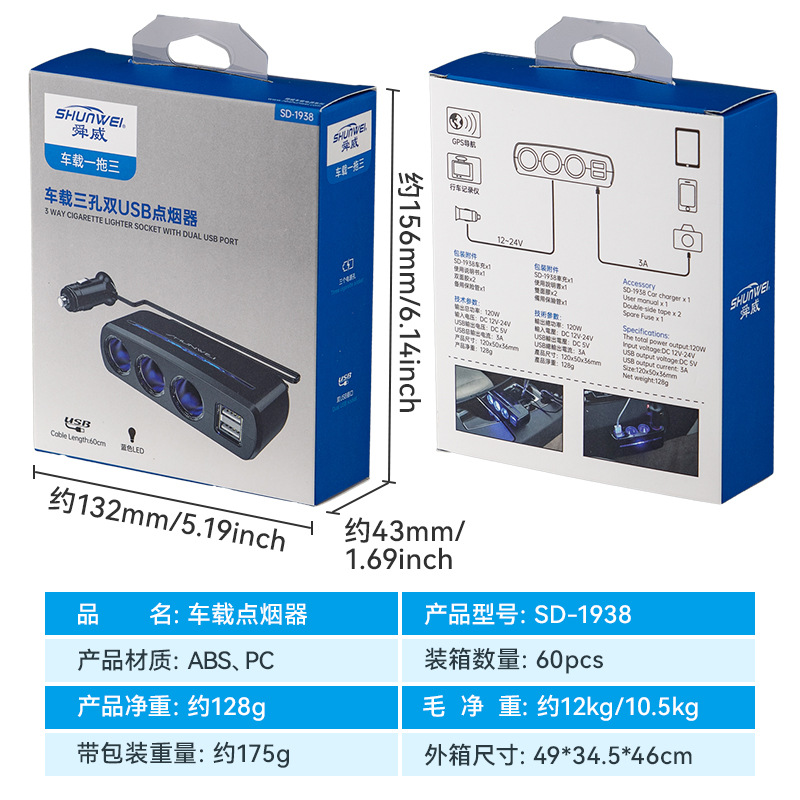 Car One-point Three-point Cigarette Lighter Plug Dual USBCar Charger Shunwei Car One-to-three Power Distributor