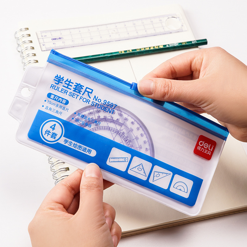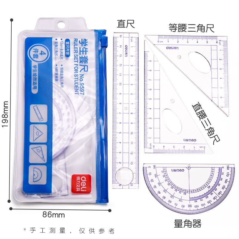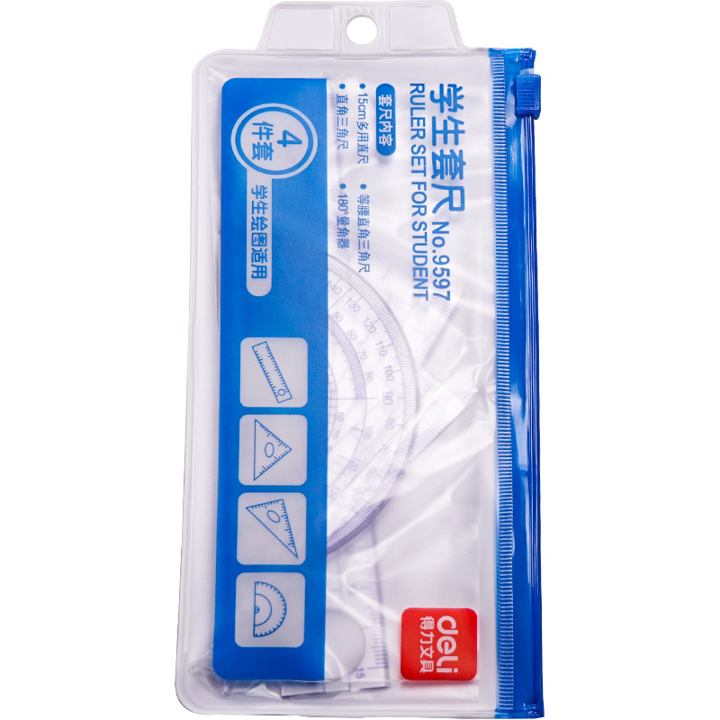 Deli9597 Primary School Student Drawing Multifunctional Combination Ruler+Triangle Ruler+Protractor4-piece Set Of Office Supplies