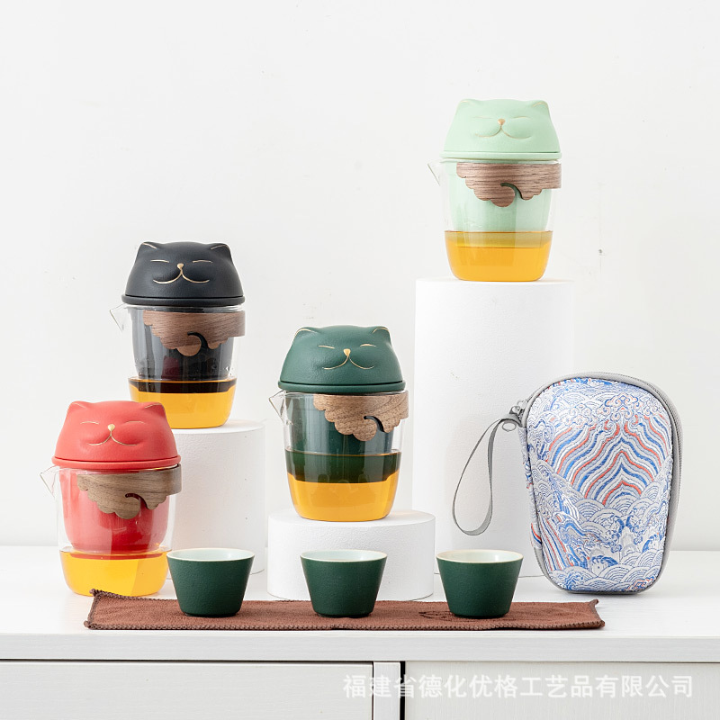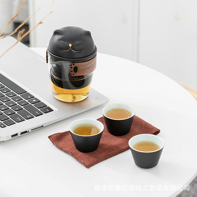 Lucky Cat Ceramic Quick Cup One Pot Three Cups Outdoor Storage Bag Portable Kung Fu Travel Tea Set