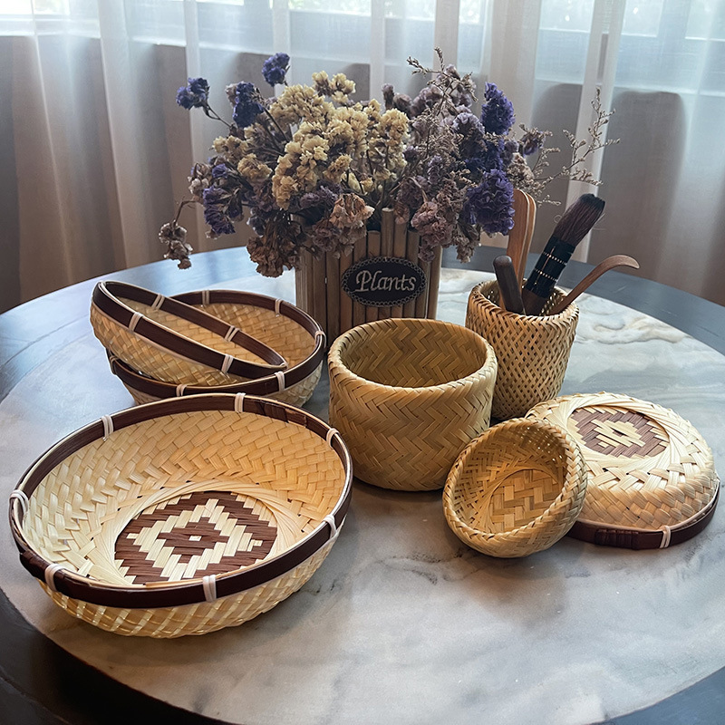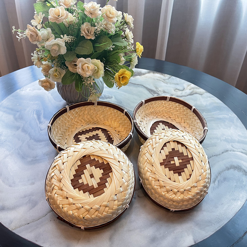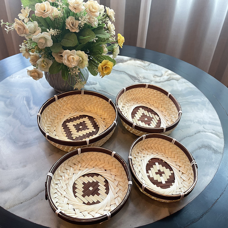 Color-blocked Bamboo Fruit Plate And Fruit Basket,Pure Hand-woven Bamboo Products,Household Round Dustpan,Candy And Biscuit Storage Basket