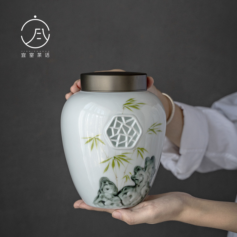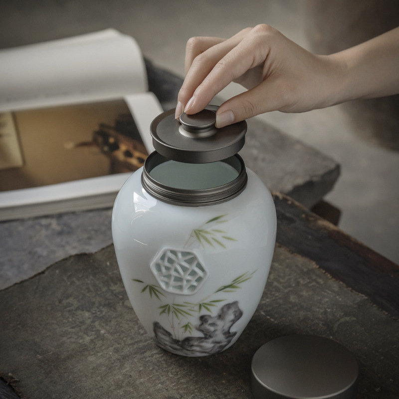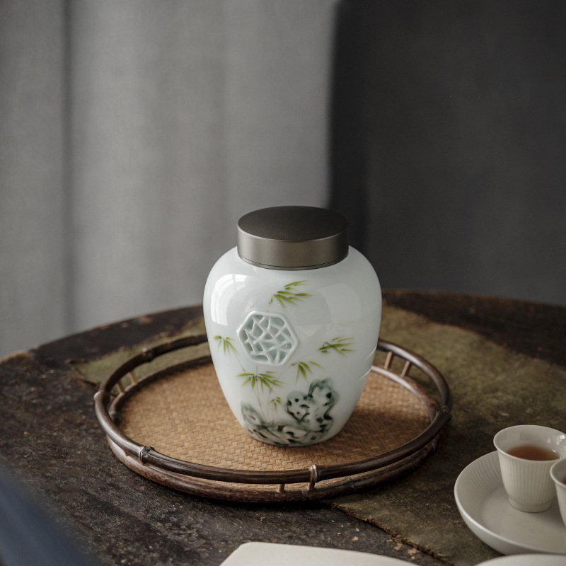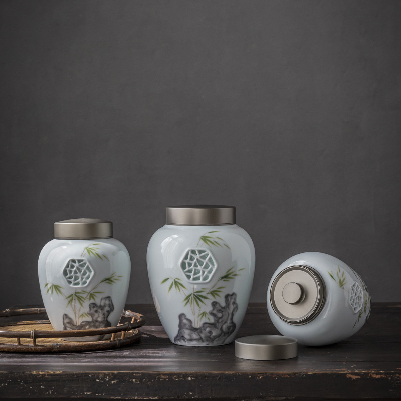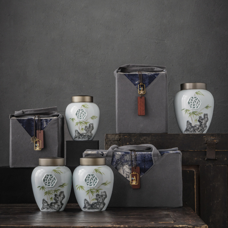 Hand-painted Embossed Window Grille Retro Tea Can Double-layer Tin Lid Ceramic Sealed Can Tea Warehouse Single And Double Cans Gift Box Cloth Bag
